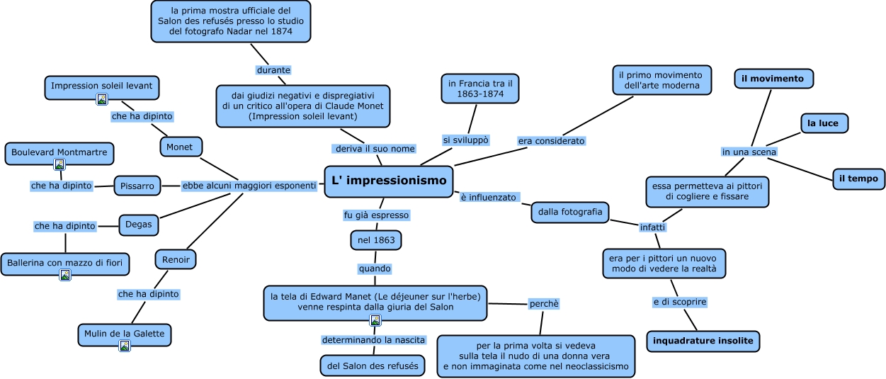 Questa Cmap, creata con IHMC CmapTools, contiene informazioni relative a: L'impressionismo, L' impressionismo ebbe alcuni maggiori esponenti Degas, Pissarro che ha dipinto Boulevard Montmartre, dalla fotografia infatti essa permetteva ai pittori di cogliere e fissare, essa permetteva ai pittori di cogliere e fissare in una scena il tempo, la luce in una scena il movimento, la luce in una scena il tempo, Degas che ha dipinto Ballerina con mazzo di fiori, la tela di Edward Manet (Le déjeuner sur l'herbe) venne respinta dalla giuria del Salon determinando la nascita del Salon des refusés, L' impressionismo fu già espresso nel 1863, L' impressionismo ebbe alcuni maggiori esponenti Renoir, L' impressionismo si sviluppò in Francia tra il 1863-1874, era per i pittori un nuovo modo di vedere la realtà e di scoprire inquadrature insolite, dai giudizi negativi e dispregiativi di un critico all'opera di Claude Monet (Impression soleil levant) durante la prima mostra ufficiale del Salon des refusés presso lo studio del fotografo Nadar nel 1874, la tela di Edward Manet (Le déjeuner sur l'herbe) venne respinta dalla giuria del Salon perchè per la prima volta si vedeva sulla tela il nudo di una donna vera e non immaginata come nel neoclassicismo, L' impressionismo era considerato il primo movimento dell'arte moderna, L' impressionismo ebbe alcuni maggiori esponenti Pissarro, L' impressionismo è influenzato dalla fotografia, Monet che ha dipinto Impression soleil levant, nel 1863 quando la tela di Edward Manet (Le déjeuner sur l'herbe) venne respinta dalla giuria del Salon, Renoir che ha dipinto Mulin de la Galette