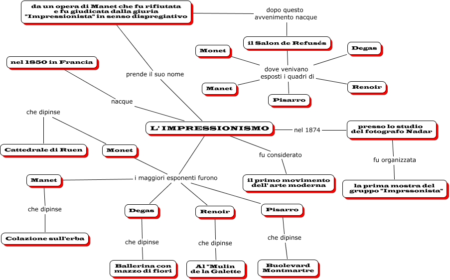 Questa Cmap, creata con IHMC CmapTools, contiene informazioni relative a: L' IMPRESSIONISMO (Arte), il Salon de Refusés dove venivano esposti i quadri di Pisarro, il Salon de Refusés dove venivano esposti i quadri di Renoir, L' IMPRESSIONISMO fu considerato il primo movimento dell' arte moderna, L' IMPRESSIONISMO nacque nel 1850 in Francia, L' IMPRESSIONISMO nel 1874 presso lo studio del fotografo Nadar, L' IMPRESSIONISMO i maggiori esponenti furono Pisarro, L' IMPRESSIONISMO i maggiori esponenti furono Degas, il Salon de Refusés dove venivano esposti i quadri di Manet, Renoir che dipinse Al "Mulin de la Galette, il Salon de Refusés dove venivano esposti i quadri di Monet, L' IMPRESSIONISMO i maggiori esponenti furono Manet, L' IMPRESSIONISMO prende il suo nome da un opera di Manet che fu rifiutata e fu giudicata dalla giuria "Impressionista" in senso dispregiativo, da un opera di Manet che fu rifiutata e fu giudicata dalla giuria "Impressionista" in senso dispregiativo dopo questo avvenimento nacque il Salon de Refusés, L' IMPRESSIONISMO i maggiori esponenti furono Monet, Pisarro che dipinse Buolevard Montmartre, L' IMPRESSIONISMO i maggiori esponenti furono Renoir, Monet che dipinse Cattedrale di Ruen, Manet che dipinse Colazione sull'erba, il Salon de Refusés dove venivano esposti i quadri di Degas, presso lo studio del fotografo Nadar fu organizzata la prima mostra del gruppo "Imprssonista"