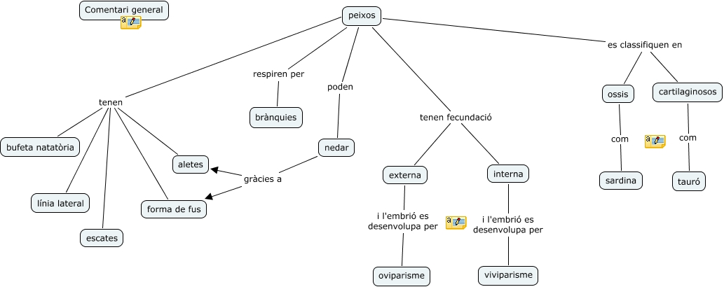Aquest mapa conceptual conté informació relacionada amb: Peixos, peixos tenen fecundació interna, peixos respiren per brànquies, peixos tenen forma de fus, peixos es classifiquen en cartilaginosos, nedar gràcies a aletes, ossis com sardina, nedar gràcies a forma de fus, peixos tenen escates, cartilaginosos com tauró, peixos es classifiquen en ossis, interna i l'embrió es desenvolupa per viviparisme, externa i l'embrió es desenvolupa per oviparisme, peixos tenen bufeta natatòria, peixos tenen aletes, peixos tenen fecundació externa, peixos poden nedar, peixos tenen línia lateral