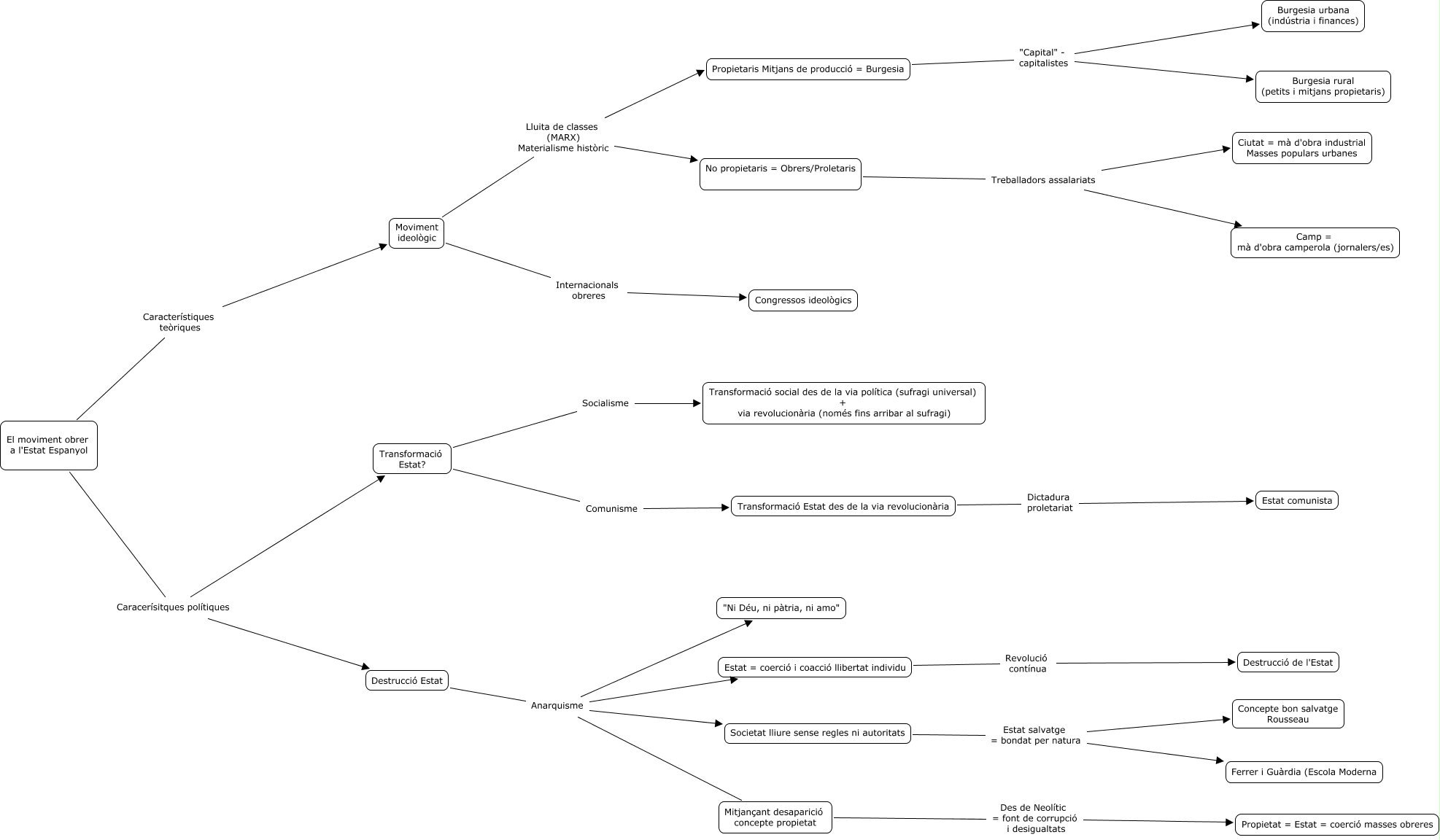 Aquest mapa conceptual conté informació relacionada amb: El moviment obrer a l'Estat Espanyol, Moviment ideològic Lluita de classes (MARX) Materialisme històric No propietaris = Obrers/Proletaris, Transformació Estat des de la via revolucionària Dictadura proletariat Estat comunista, Moviment ideològic Lluita de classes (MARX) Materialisme històric Propietaris Mitjans de producció = Burgesia, Transformació Estat? Comunisme Transformació Estat des de la via revolucionària, No propietaris = Obrers/Proletaris Treballadors assalariats Ciutat = mà d'obra industrial Masses populars urbanes, Societat lliure sense regles ni autoritats Estat salvatge = bondat per natura Ferrer i Guàrdia (Escola Moderna, Mitjançant desaparició concepte propietat Des de Neolític = font de corrupció i desigualtats Propietat = Estat = coerció masses obreres, Moviment ideològic Internacionals obreres Congressos ideològics, Destrucció Estat Anarquisme Estat = coerció i coacció llibertat individu, Destrucció Estat Anarquisme Mitjançant desaparició concepte propietat, Transformació Estat? Socialisme Transformació social des de la via política (sufragi universal) + via revolucionària (només fins arribar al sufragi), Destrucció Estat Anarquisme Societat lliure sense regles ni autoritats, El moviment obrer a l'Estat Espanyol Característiques teòriques Moviment ideològic, El moviment obrer a l'Estat Espanyol Caracerísitques polítiques Destrucció Estat, Societat lliure sense regles ni autoritats Estat salvatge = bondat per natura Concepte bon salvatge Rousseau, Estat = coerció i coacció llibertat individu Revolució contínua Destrucció de l'Estat, Propietaris Mitjans de producció = Burgesia "Capital" - capitalistes Burgesia rural (petits i mitjans propietaris), Propietaris Mitjans de producció = Burgesia "Capital" - capitalistes Burgesia urbana (indústria i finances), Destrucció Estat Anarquisme "Ni Déu, ni pàtria, ni amo", El moviment obrer a l'Estat Espanyol Caracerísitques polítiques Transformació Estat?