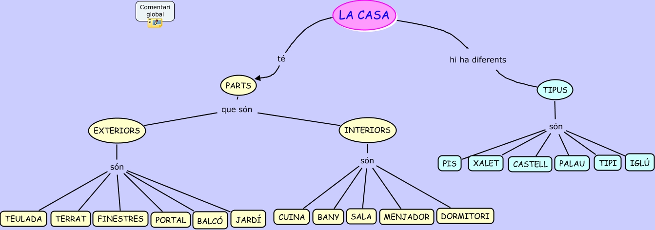 Aquest mapa conceptual conté informació relacionada amb: La casa2, EXTERIORS són JARDÍ, INTERIORS són DORMITORI, PARTS que són EXTERIORS, LA CASA hi ha diferents TIPUS, EXTERIORS són PORTAL, TIPUS són CASTELL, EXTERIORS són TEULADA, PARTS que són INTERIORS, TIPUS són XALET, INTERIORS són MENJADOR, LA CASA té PARTS, TIPUS són PIS, EXTERIORS són TERRAT, TIPUS són IGLÚ, EXTERIORS són FINESTRES, INTERIORS són BANY, TIPUS són TIPI, INTERIORS són CUINA, TIPUS són PALAU, EXTERIORS són BALCÓ