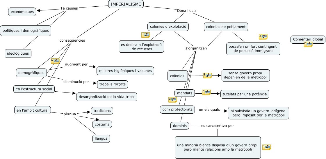 Aquest mapa conceptual conté informació relacionada amb: Imperialisme_1, IMPERIALISME Dóna lloc a colònies de poblament, en l'àmbit cultural pèrdua tradicions, colònies sense govern propi depenien de la metròpoli, IMPERIALISME conseqüències en l'àmbit cultural, dominis es carcateritza per una minoria blanca disposa d'un govern propi però manté relacions amb la metròpoli, IMPERIALISME Té causes econòmiques, colònies d'explotació s'organitzen colònies, IMPERIALISME Té causes ideològiques, en l'àmbit cultural pèrdua llengua, IMPERIALISME conseqüències en l'estructura social, com protectorats en els quals hi subsistia un govern indígena però imposat per la metròpoli, IMPERIALISME Té causes polítiques i demogràfiques, colònies de poblament s'organitzen dominis, mandats tutelats per una potència, IMPERIALISME Dóna lloc a colònies d'explotació, colònies de poblament s'organitzen colònies, colònies d'explotació es dedica a l'explotació de recursos, demogràfiques disminució per treballs forçats, colònies de poblament posseïen un fort contingent de població immigrant, colònies d'explotació s'organitzen mandats