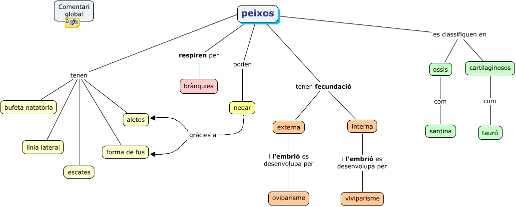 Aquest mapa conceptual conté informació relacionada amb: Peixos modificat, peixos es classifiquen en cartilaginosos, peixos tenen forma de fus, peixos respiren per brànquies, ossis com sardina, peixos tenen escates, nedar gràcies a forma de fus, cartilaginosos com tauró, peixos es classifiquen en ossis, nedar gràcies a aletes, externa i l'embrió es desenvolupa per oviparisme, peixos tenen bufeta natatòria, peixos poden nedar, peixos tenen fecundació externa, peixos tenen aletes, peixos tenen fecundació interna, peixos tenen línia lateral, interna i l'embrió es desenvolupa per viviparisme
