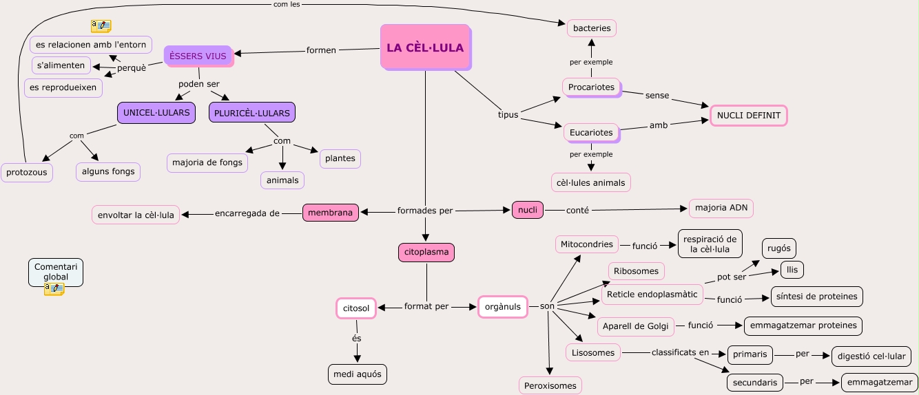 Este Cmap, tiene información relacionada con: La cèl·lula 3r cicle EP (millorat), protozous com les bacteries, Reticle endoplasmàtic pot ser llis, LA CÈL·LULA tipus Eucariotes, ÈSSERS VIUS poden ser UNICEL·LULARS, Mitocondries funció respiració de la cèl·lula, citoplasma format per citosol, Procariotes sense NUCLI DEFINIT, PLURICÈL·LULARS com majoria de fongs, LA CÈL·LULA formades per membrana, nucli conté majoria ADN, citosol és medi aquós, Aparell de Golgi funció emmagatzemar proteines, PLURICÈL·LULARS com animals, PLURICÈL·LULARS com plantes, Reticle endoplasmàtic funció síntesi de proteines, ÈSSERS VIUS perquè es reprodueixen, secundaris per emmagatzemar, orgànuls son Ribosomes, orgànuls son Aparell de Golgi, Procariotes per exemple bacteries