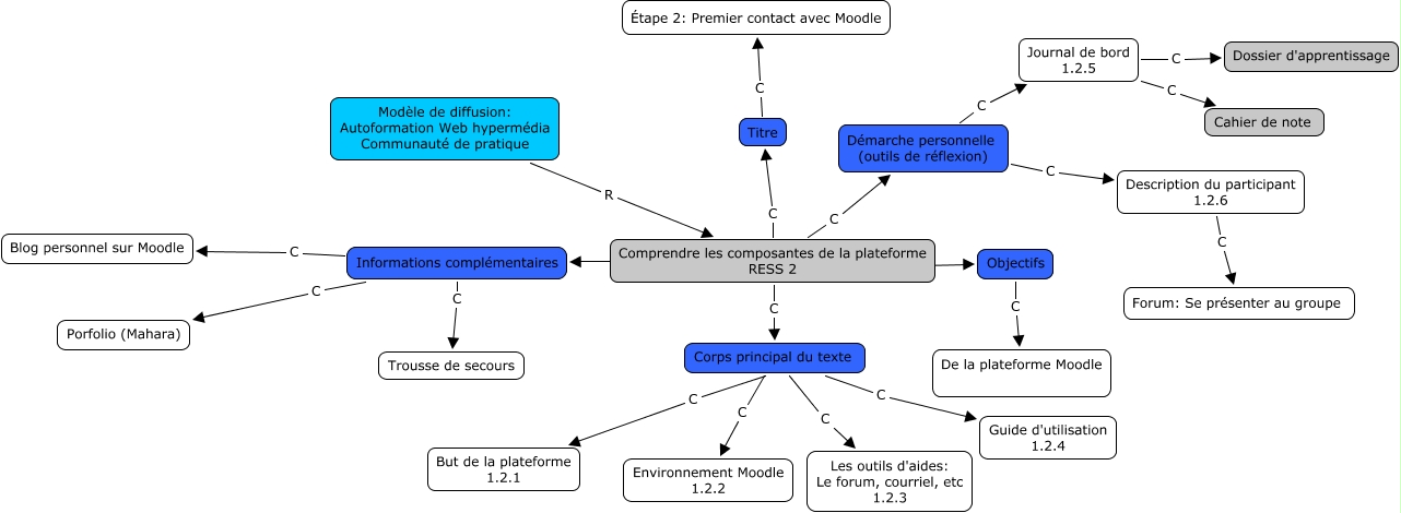 Cette carte de concepts créée avec IHMC CmapTools traite de: Moodle_contenu, Comprendre les composantes de la plateforme RESS 2 C Démarche personnelle (outils de réflexion), Corps principal du texte C Environnement Moodle 1.2.2, Journal de bord 1.2.5 C Dossier d'apprentissage, Comprendre les composantes de la plateforme RESS 2 C Informations complémentaires, Corps principal du texte C Les outils d'aides: Le forum, courriel, etc 1.2.3, Description du participant 1.2.6 C Forum: Se présenter au groupe, Objectifs C De la plateforme Moodle, Journal de bord 1.2.5 C Cahier de note, Corps principal du texte C Guide d'utilisation 1.2.4, Comprendre les composantes de la plateforme RESS 2 C Titre, Informations complémentaires C Porfolio (Mahara), Titre C Étape 2: Premier contact avec Moodle, Comprendre les composantes de la plateforme RESS 2 C Corps principal du texte, Informations complémentaires C Trousse de secours, Démarche personnelle (outils de réflexion) C Journal de bord 1.2.5, Comprendre les composantes de la plateforme RESS 2 C Objectifs, Démarche personnelle (outils de réflexion) C Description du participant 1.2.6, Informations complémentaires C Blog personnel sur Moodle