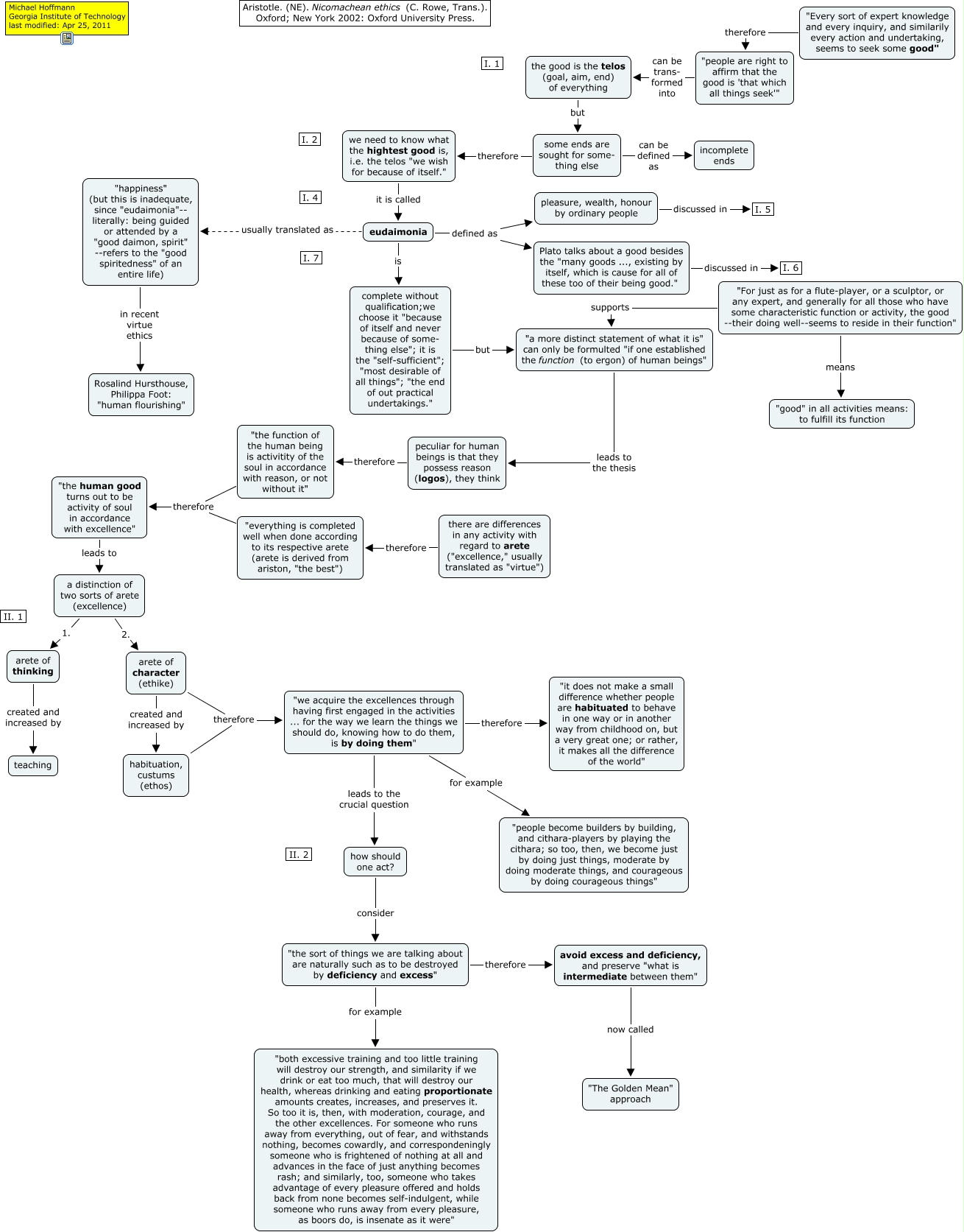 This Concept Map, created with IHMC CmapTools, has information related to: Aristotle, NE, MH-2011, habituation, custums (ethos) therefore "we acquire the excellences through having first engaged in the activities ... for the way we learn the things we should do, knowing how to do them, is by doing them", pleasure, wealth, honour by ordinary people discussed in I. 5, "the function of the human being is activitity of the soul in accordance with reason, or not without it" therefore "the human good turns out to be activity of soul in accordance with excellence", a distinction of two sorts of arete (excellence) 1. arete of thinking, "everything is completed well when done according to its respective arete (arete is derived from ariston, "the best") therefore "the human good turns out to be activity of soul in accordance with excellence", "the sort of things we are talking about are naturally such as to be destroyed by deficiency and excess" for example "both excessive training and too little training will destroy our strength, and similarity if we drink or eat too much, that will destroy our health, whereas drinking and eating proportionate amounts creates, increases, and preserves it. So too it is, then, with moderation, courage, and the other excellences. For someone who runs away from everything, out of fear, and withstands nothing, becomes cowardly, and correspondeningly someone who is frightened of nothing at all and advances in the face of just anything becomes rash; and similarly, too, someone who takes advantage of every pleasure offered and holds back from none becomes self-indulgent, while someone who runs away from every pleasure, as boors do, is insenate as it were", a distinction of two sorts of arete (excellence) 2. arete of character (ethike), arete of character (ethike) therefore "we acquire the excellences through having first engaged in the activities ... for the way we learn the things we should do, knowing how to do them, is by doing them", "we acquire the excellences through having first engaged in the activities ... for the way we learn the things we should do, knowing how to do them, is by doing them" for example "people become builders by building, and cithara-players by playing the cithara; so too, then, we become just by doing just things, moderate by doing moderate things, and courageous by doing courageous things", "happiness" (but this is inadequate, since "eudaimonia"-- literally: being guided or attended by a "good daimon, spirit" --refers to the "good spiritedness" of an entire life) in recent virtue ethics Rosalind Hursthouse, Philippa Foot: "human flourishing", "the sort of things we are talking about are naturally such as to be destroyed by deficiency and excess" therefore avoid excess and deficiency, and preserve "what is intermediate between them", eudaimonia defined as pleasure, wealth, honour by ordinary people, the good is the telos (goal, aim, end) of everything but some ends are sought for some- thing else, avoid excess and deficiency, and preserve "what is intermediate between them" now called "The Golden Mean" approach, "a more distinct statement of what it is" can only be formulted "if one established the function (to ergon) of human beings" leads to the thesis peculiar for human beings is that they possess reason (logos), they think, eudaimonia usually translated as "happiness" (but this is inadequate, since "eudaimonia"-- literally: being guided or attended by a "good daimon, spirit" --refers to the "good spiritedness" of an entire life), "we acquire the excellences through having first engaged in the activities ... for the way we learn the things we should do, knowing how to do them, is by doing them" leads to the crucial question how should one act?, Plato talks about a good besides the "many goods ..., existing by itself, which is cause for all of these too of their being good." discussed in I. 6, eudaimonia is complete without qualification;we choose it "because of itself and never because of some- thing else"; it is the "self-sufficient"; "most desirable of all things"; "the end of out practical undertakings.", arete of thinking created and increased by teaching