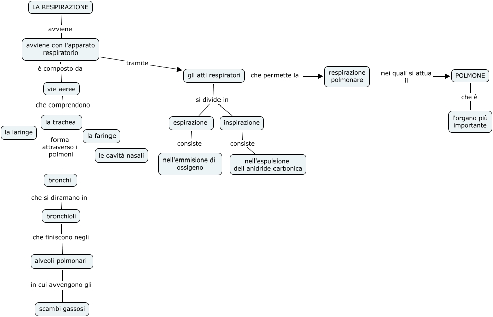 Questa Cmap, creata con IHMC CmapTools, contiene informazioni relative a: La respirazione, la trachea forma attraverso i polmoni bronchi, espirazione consiste nell'emmisione di ossigeno, gli atti respiratori si divide in inspirazione, gli atti respiratori che permette la respirazione polmonare, avviene con l'apparato respiratorio tramite gli atti respiratori, bronchioli che finiscono negli alveoli polmonari, gli atti respiratori si divide in espirazione, vie aeree che comprendono la trachea, LA RESPIRAZIONE avviene avviene con l'apparato respiratorio, avviene con l'apparato respiratorio è composto da vie aeree, POLMONE che è l'organo più importante, bronchi che si diramano in bronchioli, respirazione polmonare nei quali si attua il POLMONE, alveoli polmonari in cui avvengono gli scambi gassosi, inspirazione consiste nell'espulsione dell anidride carbonica