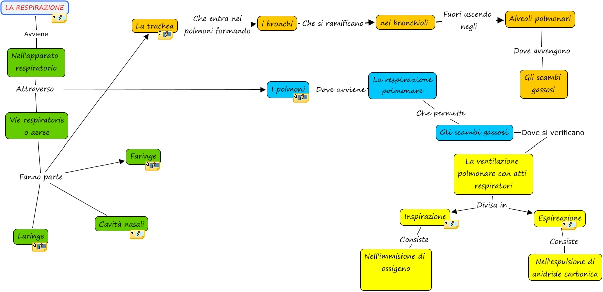 Questa Cmap, creata con IHMC CmapTools, contiene informazioni relative a: La respirazione, Inspirazione Consiste Nell'immisione di ossigeno, Gli scambi gassosi Dove si verificano La ventilazione polmonare con atti respiratori, La ventilazione polmonare con atti respiratori Divisa in Espireazione, Nell'apparato respiratorio Attraverso Vie respiratorie o aeree, Vie respiratorie o aeree Fanno parte Faringe, LA RESPIRAZIONE Avviene Nell'apparato respiratorio, Vie respiratorie o aeree Fanno parte La trachea, Alveoli polmonari Dove avvengono Gli scambi gassosi, Espireazione Consiste Nell'espulsione di anidride carbonica, Nell'apparato respiratorio Attraverso I polmoni, I polmoni Dove avviene La respirazione polmonare, La respirazione polmonare Che permette Gli scambi gassosi, La trachea Che entra nei polmoni formando i bronchi, Vie respiratorie o aeree Fanno parte Laringe, La ventilazione polmonare con atti respiratori Divisa in Inspirazione, Vie respiratorie o aeree Fanno parte Cavità nasali, i bronchi Che si ramificano nei bronchioli, nei bronchioli Fuori uscendo negli Alveoli polmonari