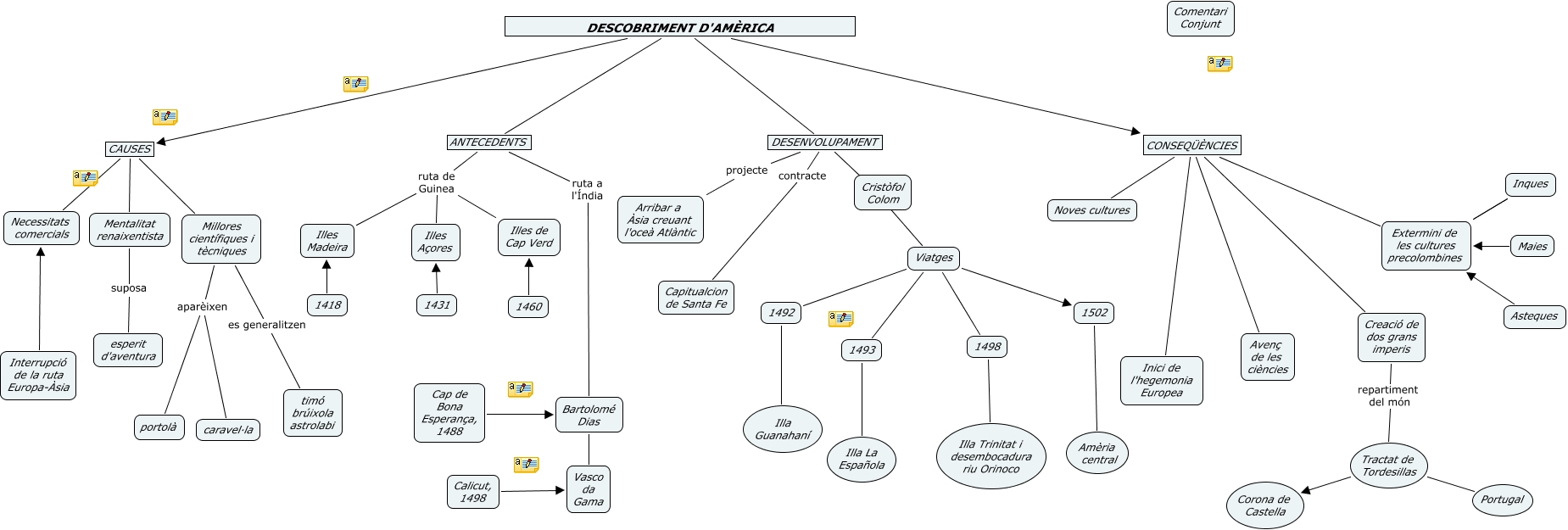Aquest mapa conceptual conté informació relacionada amb: Descobriment d'Amèrica, Viatges 1492, 1498 Illa Trinitat i desembocadura riu Orinoco, DESENVOLUPAMENT ???? Viatges, Millores científiques i tècniques aparèixen portolà, Viatges 1498, Cap de Bona Esperança, 1488 Bartolomé Dias, Millores científiques i tècniques es generalitzen timó brúixola astrolabi, DESCOBRIMENT D'AMÈRICA ANTECEDENTS, Viatges 1502, DESCOBRIMENT D'AMÈRICA CAUSES, 1493 Illa La Española, 1431 Illes Açores, Millores científiques i tècniques aparèixen caravel·la, 1492 Illa Guanahaní, CONSEQÜÈNCIES Noves cultures, ANTECEDENTS ruta de Guinea Illes Madeira, Calicut, 1498 Vasco da Gama, CONSEQÜÈNCIES Avenç de les ciències, Tractat de Tordesillas Corona de Castella, ANTECEDENTS ruta de Guinea Illes Açores