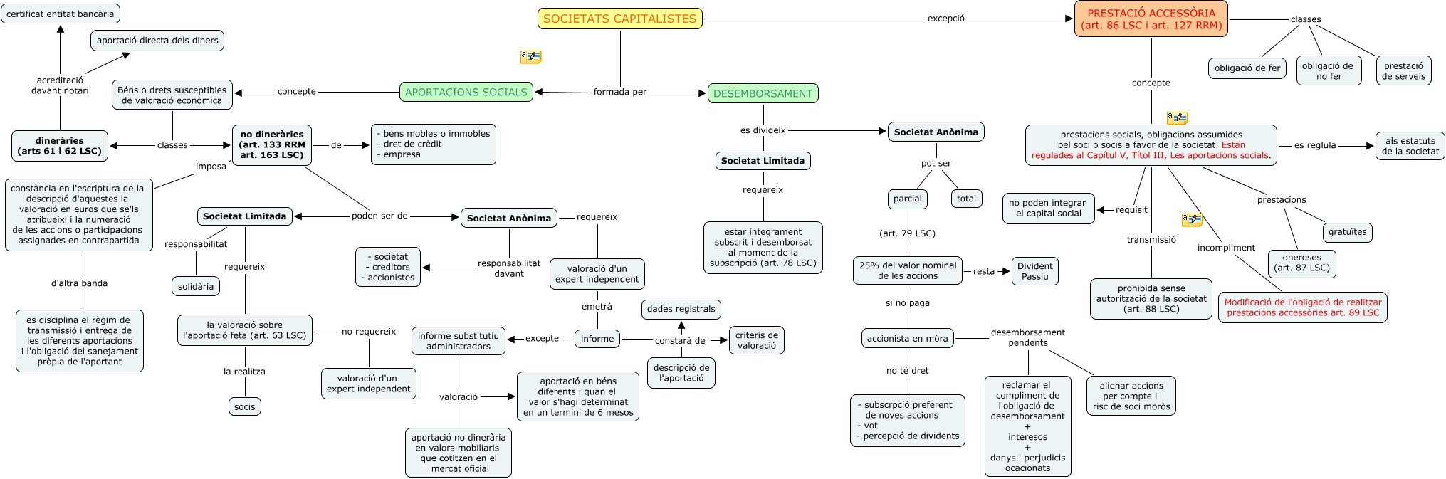 Este Cmap, tiene información relacionada con: Mapa conceptual 2, la valoració sobre l'aportació feta (art. 63 LSC) la realitza socis, prestacions socials, obligacions assumides pel soci o socis a favor de la societat. Estàn regulades al Capítul V, Títol III, Les aportacions socials. transmissió prohibida sense autorització de la societat (art. 88 LSC), constància en l'escriptura de la descripció d'aquestes la valoració en euros que se'ls atribueixi i la numeració de les accions o participacions assignades en contrapartida d'altra banda es disciplina el règim de transmissió i entrega de les diferents aportacions i l'obligació del sanejament pròpia de l'aportant, Societat Anònima pot ser total, informe substitutiu administradors valoració aportació en béns diferents i quan el valor s'hagi determinat en un termini de 6 mesos, prestacions socials, obligacions assumides pel soci o socis a favor de la societat. Estàn regulades al Capítul V, Títol III, Les aportacions socials. prestacions gratuïtes, no dineràries (art. 133 RRM art. 163 LSC) poden ser de Societat Limitada, prestacions socials, obligacions assumides pel soci o socis a favor de la societat. Estàn regulades al Capítul V, Títol III, Les aportacions socials. incompliment Modificació de l'obligació de realitzar prestacions accessòries art. 89 LSC, SOCIETATS CAPITALISTES excepció PRESTACIÓ ACCESSÒRIA (art. 86 LSC i art. 127 RRM), accionista en mòra no té dret - subscrpció preferent de noves accions - vot - percepció de dividents, informe excepte informe substitutiu administradors, no dineràries (art. 133 RRM art. 163 LSC) de - béns mobles o immobles - dret de crèdit - empresa, DESEMBORSAMENT es divideix Societat Anònima, DESEMBORSAMENT es divideix Societat Limitada, informe constarà de descripció de l'aportació, prestacions socials, obligacions assumides pel soci o socis a favor de la societat. Estàn regulades al Capítul V, Títol III, Les aportacions socials. es reglula als estatuts de la societat, SOCIETATS CAPITALISTES formada per DESEMBORSAMENT, no dineràries (art. 133 RRM art. 163 LSC) imposa constància en l'escriptura de la descripció d'aquestes la valoració en euros que se'ls atribueixi i la numeració de les accions o participacions assignades en contrapartida, accionista en mòra desemborsament pendents alienar accions per compte i risc de soci moròs, accionista en mòra desemborsament pendents reclamar el compliment de l'obligació de desemborsament + interesos + danys i perjudicis ocacionats