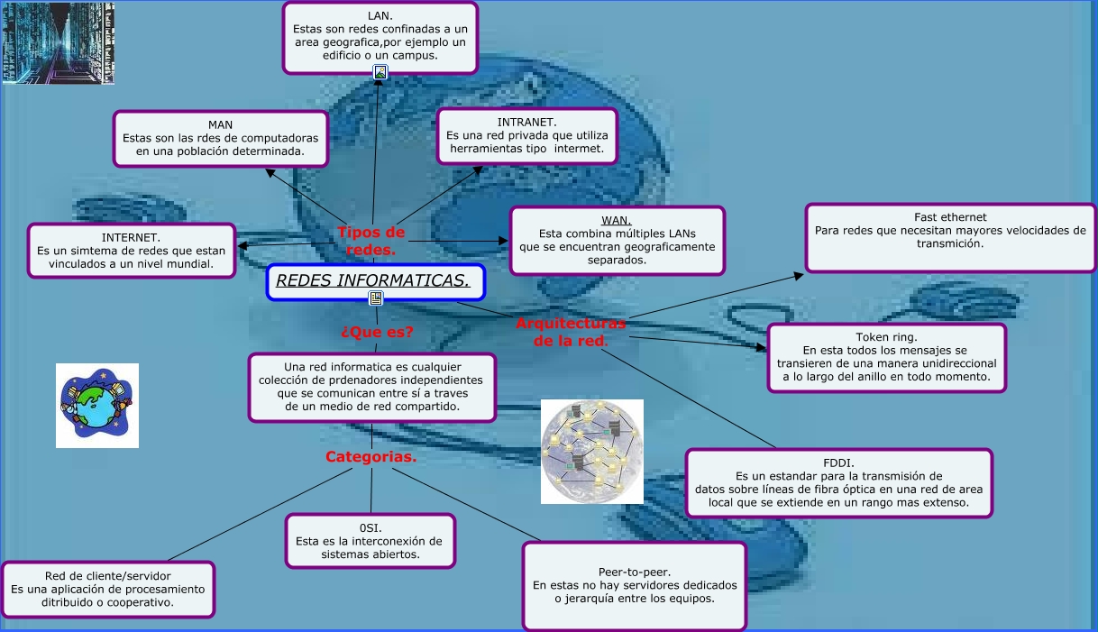 Este Cmap, tiene información relacionada con: redes informaticas 1, REDES INFORMATICAS. Tipos de redes. INTERNET. Es un simtema de redes que estan vinculados a un nivel mundial., REDES INFORMATICAS. Tipos de redes. INTRANET. Es una red privada que utiliza herramientas tipo intermet., REDES INFORMATICAS. Tipos de redes. LAN. Estas son redes confinadas a un area geografica,por ejemplo un edificio o un campus., Una red informatica es cualquier colección de prdenadores independientes que se comunican entre sí a traves de un medio de red compartido. Categorias. 0SI. Esta es la interconexión de sistemas abiertos., REDES INFORMATICAS. Arquitecturas de la red. FDDI. Es un estandar para la transmisión de datos sobre líneas de fibra óptica en una red de area local que se extiende en un rango mas extenso., Una red informatica es cualquier colección de prdenadores independientes que se comunican entre sí a traves de un medio de red compartido. Categorias. Peer-to-peer. En estas no hay servidores dedicados o jerarquía entre los equipos., REDES INFORMATICAS. Arquitecturas de la red. Fast ethernet Para redes que necesitan mayores velocidades de transmición., Una red informatica es cualquier colección de prdenadores independientes que se comunican entre sí a traves de un medio de red compartido. Categorias. Red de cliente/servidor Es una aplicación de procesamiento ditribuido o cooperativo., REDES INFORMATICAS. ¿Que es? Una red informatica es cualquier colección de prdenadores independientes que se comunican entre sí a traves de un medio de red compartido., REDES INFORMATICAS. Tipos de redes. MAN Estas son las rdes de computadoras en una población determinada., REDES INFORMATICAS. Tipos de redes. WAN. Esta combina múltiples LANs que se encuentran geograficamente separados., REDES INFORMATICAS. Arquitecturas de la red. Token ring. En esta todos los mensajes se transieren de una manera unidireccional a lo largo del anillo en todo momento.