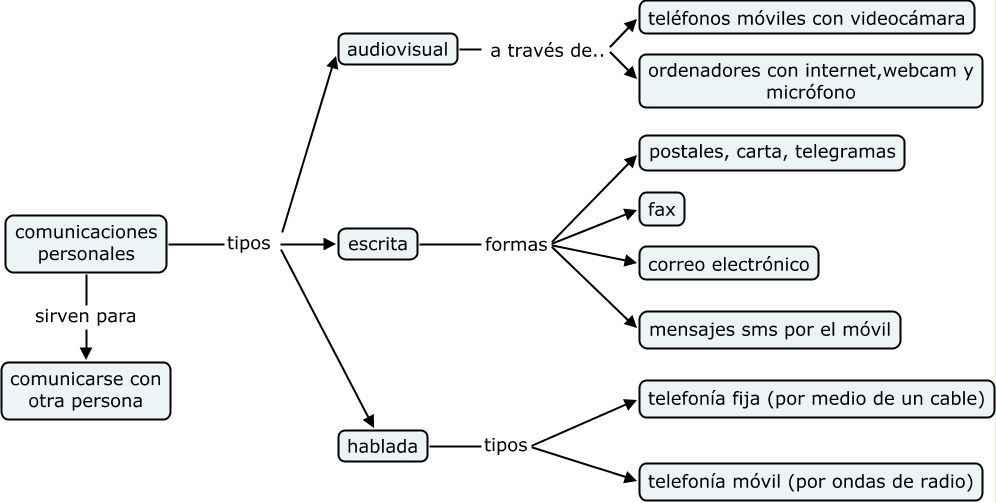 Este Cmap, tiene información relacionada con: las comunicacines personales, audiovisual a través de.. teléfonos móviles con videocámara, comunicaciones personales sirven para comunicarse con otra persona, comunicaciones personales tipos audiovisual, comunicaciones personales tipos escrita, escrita formas postales, carta, telegramas, audiovisual a través de.. ordenadores con internet,webcam y micrófono, comunicaciones personales tipos hablada, escrita formas correo electrónico, escrita formas fax, hablada tipos telefonía fija (por medio de un cable), hablada tipos telefonía móvil (por ondas de radio), escrita formas mensajes sms por el móvil