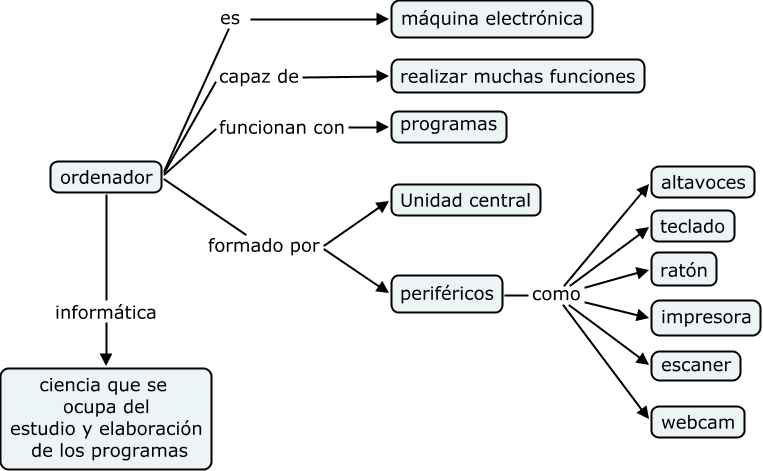 Este Cmap, tiene información relacionada con: ordenador, periféricos como teclado, periféricos como impresora, periféricos como altavoces, ordenador es máquina electrónica, ordenador capaz de realizar muchas funciones, ordenador funcionan con programas, periféricos como escaner, ordenador informática ciencia que se ocupa del estudio y elaboración de los programas, ordenador formado por periféricos, periféricos como ratón, periféricos como webcam, ordenador formado por Unidad central