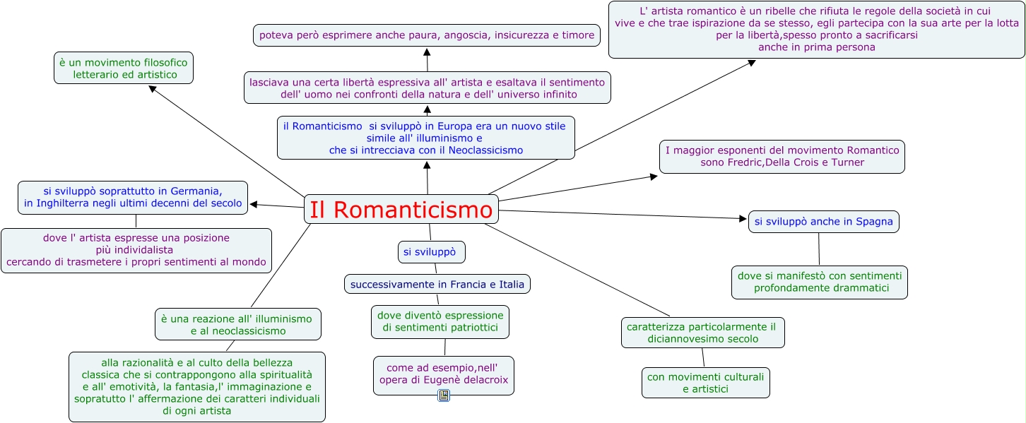 Questa Cmap, creata con IHMC CmapTools, contiene informazioni relative a: romanticismo, successivamente in Francia e Italia ???? dove diventò espressione di sentimenti patriottici, Il Romanticismo ???? è un movimento filosofico letterario ed artistico, Il Romanticismo ???? caratterizza particolarmente il diciannovesimo secolo, si sviluppò ???? successivamente in Francia e Italia, Il Romanticismo ???? si sviluppò anche in Spagna, Il Romanticismo ???? si sviluppò, è una reazione all' illuminismo e al neoclassicismo ???? alla razionalità e al culto della bellezza classica che si contrappongono alla spiritualità e all' emotività, la fantasia,l' immaginazione e sopratutto l' affermazione dei caratteri individuali di ogni artista, si sviluppò soprattutto in Germania, in Inghilterra negli ultimi decenni del secolo ???? dove l' artista espresse una posizione più individalista cercando di trasmetere i propri sentimenti al mondo, il Romanticismo si sviluppò in Europa era un nuovo stile simile all' illuminismo e che si intrecciava con il Neoclassicismo ???? lasciava una certa libertà espressiva all' artista e esaltava il sentimento dell' uomo nei confronti della natura e dell' universo infinito, Il Romanticismo ???? è una reazione all' illuminismo e al neoclassicismo, Il Romanticismo ???? si sviluppò soprattutto in Germania, in Inghilterra negli ultimi decenni del secolo, Il Romanticismo i I maggior esponenti del movimento Romantico sono Fredric,Della Crois e Turner, Il Romanticismo ???? il Romanticismo si sviluppò in Europa era un nuovo stile simile all' illuminismo e che si intrecciava con il Neoclassicismo, Il Romanticismo ???? L' artista romantico è un ribelle che rifiuta le regole della società in cui vive e che trae ispirazione da se stesso, egli partecipa con la sua arte per la lotta per la libertà,spesso pronto a sacrificarsi anche in prima persona, dove diventò espressione di sentimenti patriottici ???? come ad esempio,nell' opera di Eugenè delacroix, caratterizza particolarmente il diciannovesimo secolo ???? con movimenti culturali e artistici, lasciava una certa libertà espressiva all' artista e esaltava il sentimento dell' uomo nei confronti della natura e dell' universo infinito ???? poteva però esprimere anche paura, angoscia, insicurezza e timore, si sviluppò anche in Spagna ???? dove si manifestò con sentimenti profondamente drammatici