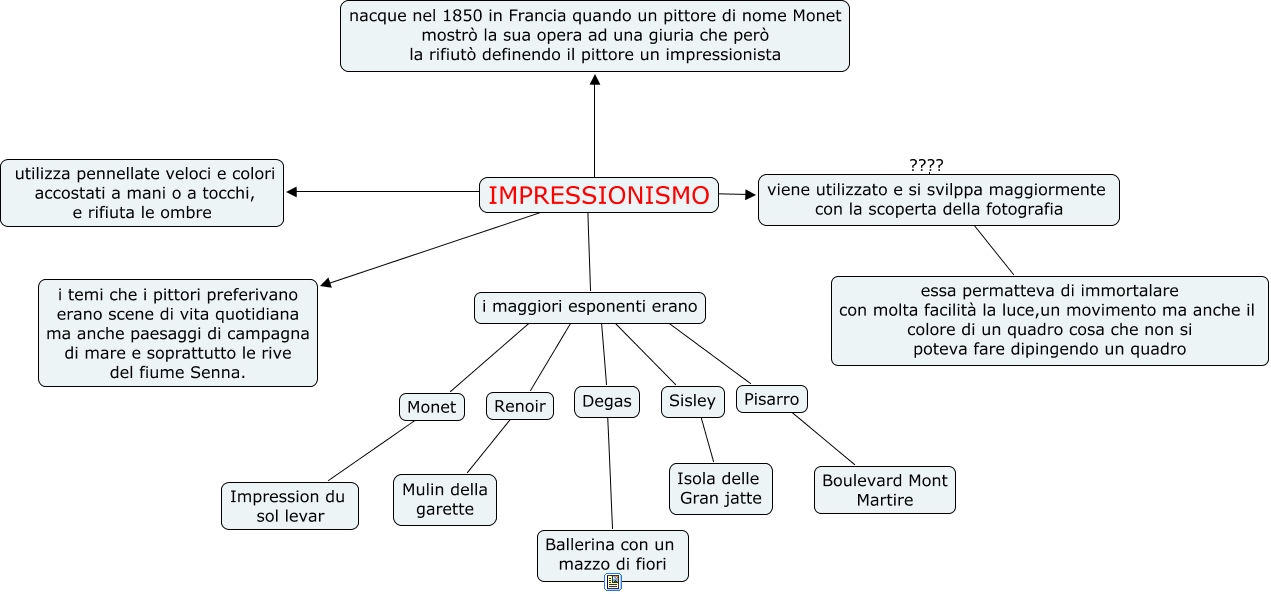 Questa Cmap, creata con IHMC CmapTools, contiene informazioni relative a: impressionismo, Pisarro ???? Boulevard Mont Martire, viene utilizzato e si svilppa maggiormente con la scoperta della fotografia ???? essa permatteva di immortalare con molta facilità la luce,un movimento ma anche il colore di un quadro cosa che non si poteva fare dipingendo un quadro, Sisley ???? Isola delle Gran jatte, IMPRESSIONISMO ???? i maggiori esponenti erano, IMPRESSIONISMO ???? nacque nel 1850 in Francia quando un pittore di nome Monet mostrò la sua opera ad una giuria che però la rifiutò definendo il pittore un impressionista, IMPRESSIONISMO ???? viene utilizzato e si svilppa maggiormente con la scoperta della fotografia, IMPRESSIONISMO ???? utilizza pennellate veloci e colori accostati a mani o a tocchi, e rifiuta le ombre, i maggiori esponenti erano ???? Monet, i maggiori esponenti erano ???? Renoir, IMPRESSIONISMO ???? i temi che i pittori preferivano erano scene di vita quotidiana ma anche paesaggi di campagna di mare e soprattutto le rive del fiume Senna., i maggiori esponenti erano ???? Degas, i maggiori esponenti erano ???? Pisarro, Renoir ???? Mulin della garette, Degas ???? Ballerina con un mazzo di fiori, Monet ???? Impression du sol levar, i maggiori esponenti erano ???? Sisley