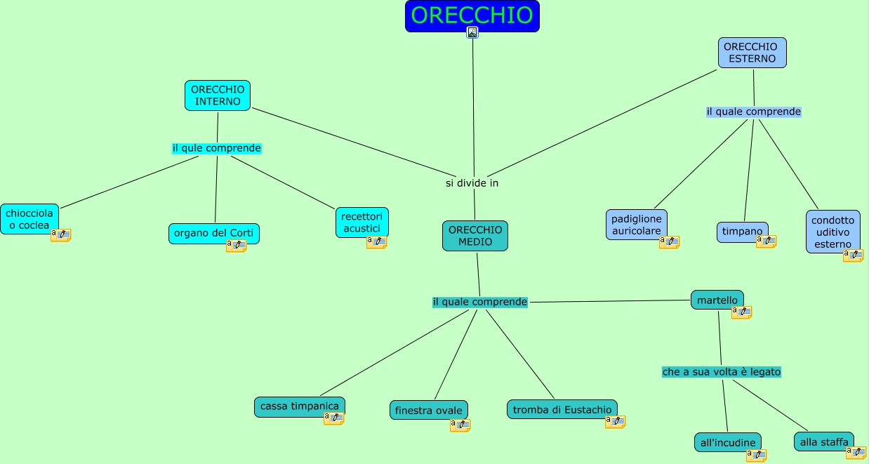 Questa Cmap, creata con IHMC CmapTools, contiene informazioni relative a: l'orecchio, ORECCHIO ESTERNO il quale comprende condotto uditivo esterno, ORECCHIO ESTERNO il quale comprende padiglione auricolare, ORECCHIO si divide in ORECCHIO ESTERNO, martello che a sua volta è legato alla staffa, ORECCHIO MEDIO il quale comprende finestra ovale, ORECCHIO INTERNO il qule comprende recettori acustici, ORECCHIO si divide in ORECCHIO INTERNO, martello che a sua volta è legato all'incudine, ORECCHIO MEDIO il quale comprende cassa timpanica, ORECCHIO INTERNO il qule comprende organo del Corti, ORECCHIO ESTERNO il quale comprende timpano, ORECCHIO MEDIO il quale comprende martello, ORECCHIO si divide in ORECCHIO MEDIO, ORECCHIO INTERNO il qule comprende chiocciola o coclea, ORECCHIO MEDIO il quale comprende tromba di Eustachio
