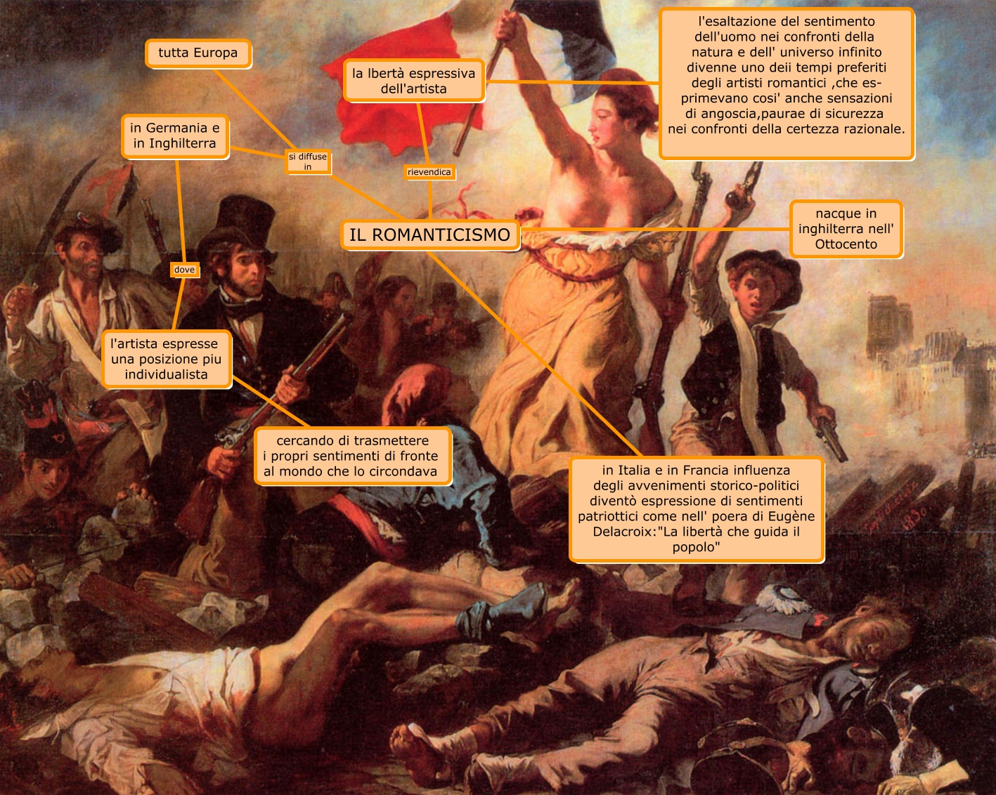 Questa Cmap, creata con IHMC CmapTools, contiene informazioni relative a: Il Romanticismo, la lbertà espressiva dell'artista ???? l'esaltazione del sentimento dell'uomo nei confronti della natura e dell' universo infinito divenne uno deii tempi preferiti degli artisti romantici ,che es- primevano cosi' anche sensazioni di angoscia,paurae di sicurezza nei confronti della certezza razionale., IL ROMANTICISMO rievendica la lbertà espressiva dell'artista, IL ROMANTICISMO si diffuse in in Germania e in Inghilterra, in Germania e in Inghilterra dove l'artista espresse una posizione piu individualista, l'artista espresse una posizione piu individualista ???? cercando di trasmettere i propri sentimenti di fronte al mondo che lo circondava, IL ROMANTICISMO si diffuse in tutta Europa, nacque in inghilterra nell' Ottocento ???? IL ROMANTICISMO, IL ROMANTICISMO ???? in Italia e in Francia influenza degli avvenimenti storico-politici diventò espressione di sentimenti patriottici come nell' poera di Eugène Delacroix:"La libertà che guida il popolo"