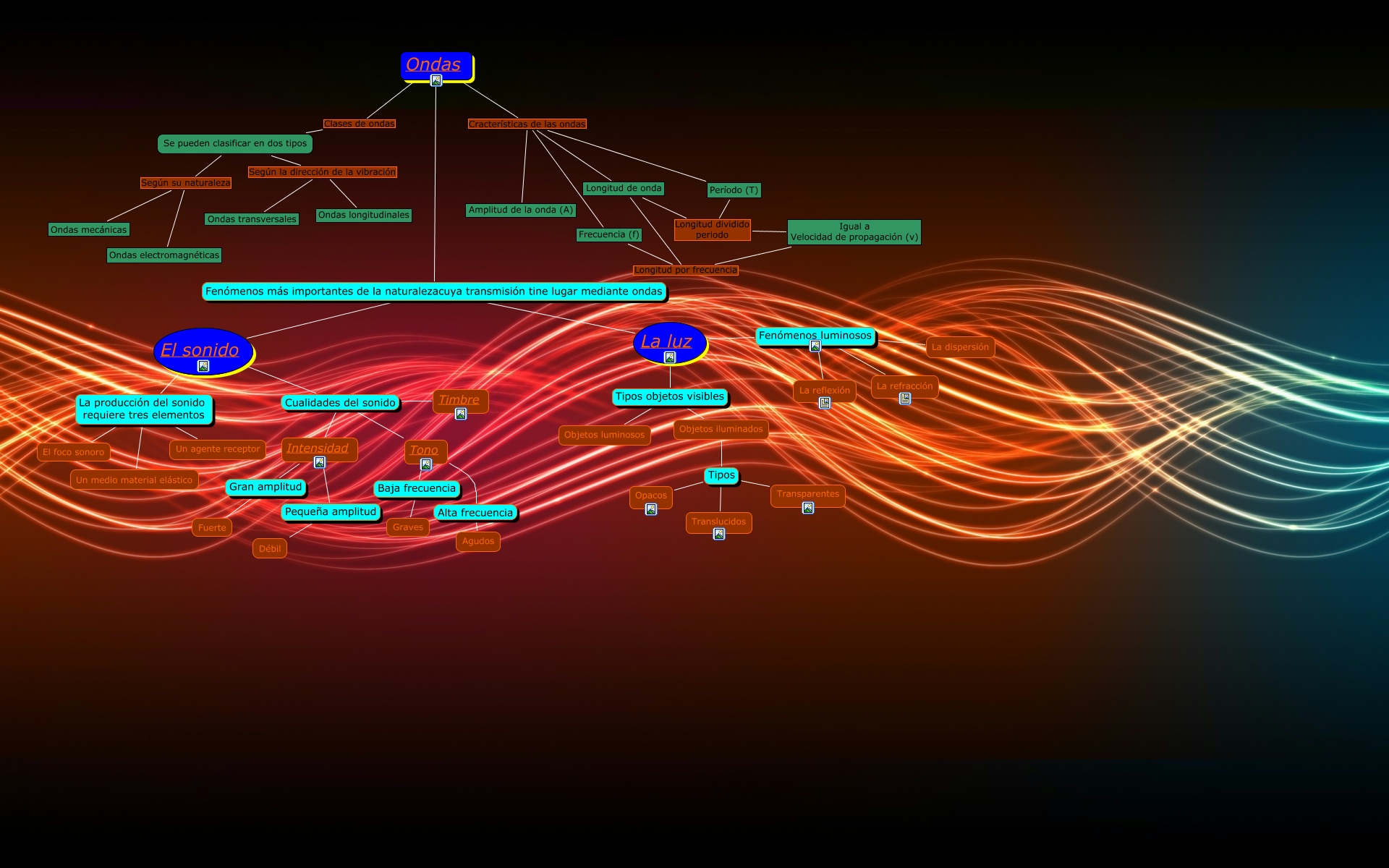 Este Cmap, tiene información relacionada con: XRodrigoCaballero4ESO, Tono Baja frecuencia Graves, Intensidad Gran amplitud Fuerte, Longitud de onda Longitud por frecuencia Igual a Velocidad de propagación (v), El sonido Cualidades del sonido Timbre, Ondas Clases de ondas Se pueden clasificar en dos tipos, Ondas Fenómenos más importantes de la naturalezacuya transmisión tine lugar mediante ondas El sonido, Ondas Cracterísticas de las ondas Amplitud de la onda (A), Ondas longitudinales Según la dirección de la vibración Ondas transversales, Longitud de onda Longitud dividido periodo Período (T), La luz Tipos objetos visibles Objetos iluminados, Objetos iluminados Tipos Opacos, La luz Fenómenos luminosos La reflexión, Se pueden clasificar en dos tipos Según su naturaleza Ondas electromagnéticas, Se pueden clasificar en dos tipos Según su naturaleza Ondas mecánicas, El sonido La producción del sonido requiere tres elementos El foco sonoro, El sonido La producción del sonido requiere tres elementos Un agente receptor, La luz Fenómenos luminosos La dispersión, Ondas Cracterísticas de las ondas Frecuencia (f), La luz Fenómenos luminosos La refracción, Tono Alta frecuencia Agudos