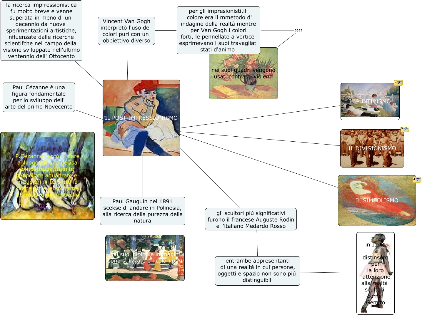 Questa Cmap, creata con IHMC CmapTools, contiene informazioni relative a: Il Post-Impressionismo, Paul Gauguin nel 1891 scekse di andare in Polinesia, alla ricerca della purezza della natura ???? nei suoi dipintile immagini sono stilizzate e i colori puri, Vincent Van Gogh interpretò l'uso dei colori puri con un obbiettivo diverso ???? per gli impresionisti,il colore era il mmetodo d' indagine della realtà mentre per Van Gogh i colori forti, le pennellate a vortice esprimevano i suoi travagliati stati d'animo, entrambe appresentanti di una realtà in cui persone, oggetti e spazio non sono più distinguibili ???? in Italia si distinsero per la loro attenzione alla realtà scultori come Gemito, per gli impresionisti,il colore era il mmetodo d' indagine della realtà mentre per Van Gogh i colori forti, le pennellate a vortice esprimevano i suoi travagliati stati d'animo ???? nei suoi quadri vengono usati contrasti violenti, IL POST-IMPRESSIONISMO ???? Paul Gauguin nel 1891 scekse di andare in Polinesia, alla ricerca della purezza della natura, Paul Cézanne è una figura fondamentale per lo sviluppo dell' arte del primo Novecento ???? P.Cézanne cercò di dare agli oggetti una decisa compattezza,tramite pennellate aquadrate e irregolari in terpreto la realtà attraverso forme e strutture geometriche, IL POST-IMPRESSIONISMO ???? IL SIMBOLISMO, IL POST-IMPRESSIONISMO ???? gli scultori più significativi furono il francese Auguste Rodin e l'italiano Medardo Rosso, IL POST-IMPRESSIONISMO ???? Vincent Van Gogh interpretò l'uso dei colori puri con un obbiettivo diverso, IL POST-IMPRESSIONISMO ???? IL DIVISIONISMO, gli scultori più significativi furono il francese Auguste Rodin e l'italiano Medardo Rosso ???? entrambe appresentanti di una realtà in cui persone, oggetti e spazio non sono più distinguibili, IL POST-IMPRESSIONISMO ???? la ricerca impfressionistica fu molto breve e venne superata in meno di un decennio da nuove sperimentazioni artistiche, influenzate dalle ricerche scientifche nel campo della visione sviluppate nell'ultimo ventennio dell' Ottocento, IL POST-IMPRESSIONISMO ???? Paul Cézanne è una figura fondamentale per lo sviluppo dell' arte del primo Novecento, IL POST-IMPRESSIONISMO ???? IL PUNTIVISMO