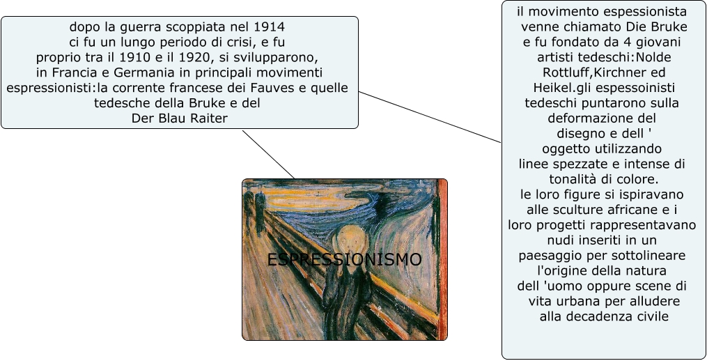 Questa Cmap, creata con IHMC CmapTools, contiene informazioni relative a: L'Espressionismo, dopo la guerra scoppiata nel 1914 ci fu un lungo periodo di crisi, e fu proprio tra il 1910 e il 1920, si svilupparono, in Francia e Germania in principali movimenti espressionisti:la corrente francese dei Fauves e quelle tedesche della Bruke e del Der Blau Raiter ???? il movimento espessionista venne chiamato Die Bruke e fu fondato da 4 giovani artisti tedeschi:Nolde Rottluff,Kirchner ed Heikel.gli espessoinisti tedeschi puntarono sulla deformazione del disegno e dell ' oggetto utilizzando linee spezzate e intense di tonalità di colore. le loro figure si ispiravano alle sculture africane e i loro progetti rappresentavano nudi inseriti in un paesaggio per sottolineare l'origine della natura dell 'uomo oppure scene di vita urbana per alludere alla decadenza civile, ESPRESSIONISMO ???? dopo la guerra scoppiata nel 1914 ci fu un lungo periodo di crisi, e fu proprio tra il 1910 e il 1920, si svilupparono, in Francia e Germania in principali movimenti espressionisti:la corrente francese dei Fauves e quelle tedesche della Bruke e del Der Blau Raiter