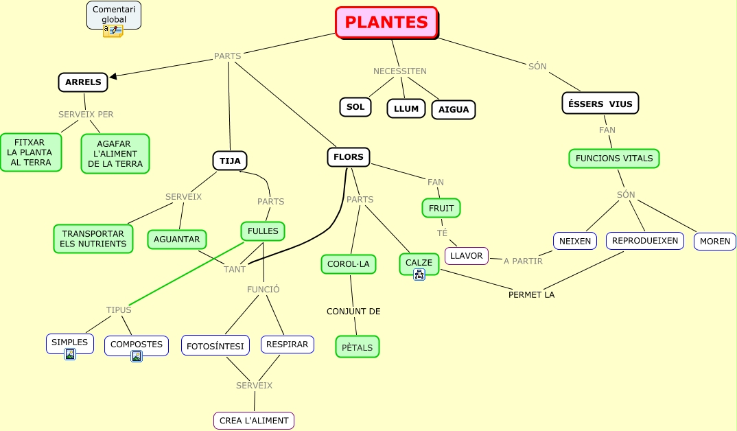 Aquest mapa conceptual conté informació relacionada amb: PLANTES 4, FULLES FUNCIÓ FOTOSÍNTESI, FUNCIONS VITALS SÓN NEIXEN, FULLES TIPUS COMPOSTES, PÈTALS CONJUNT DE COROL·LA, PLANTES PARTS ARRELS, AGUANTAR TANT FULLES, PLANTES PARTS TIJA, FRUIT TÉ LLAVOR, ARRELS SERVEIX PER FITXAR LA PLANTA AL TERRA, ARRELS SERVEIX PER AGAFAR L'ALIMENT DE LA TERRA, TIJA SERVEIX TRANSPORTAR ELS NUTRIENTS, PLANTES SÓN ÉSSERS VIUS, TIJA PARTS FULLES, FULLES FUNCIÓ RESPIRAR, PLANTES NECESSITEN AIGUA, RESPIRAR SERVEIX FOTOSÍNTESI, AGUANTAR TANT FLORS, RESPIRAR SERVEIX CREA L'ALIMENT, FLORS FAN FRUIT, PLANTES NECESSITEN LLUM