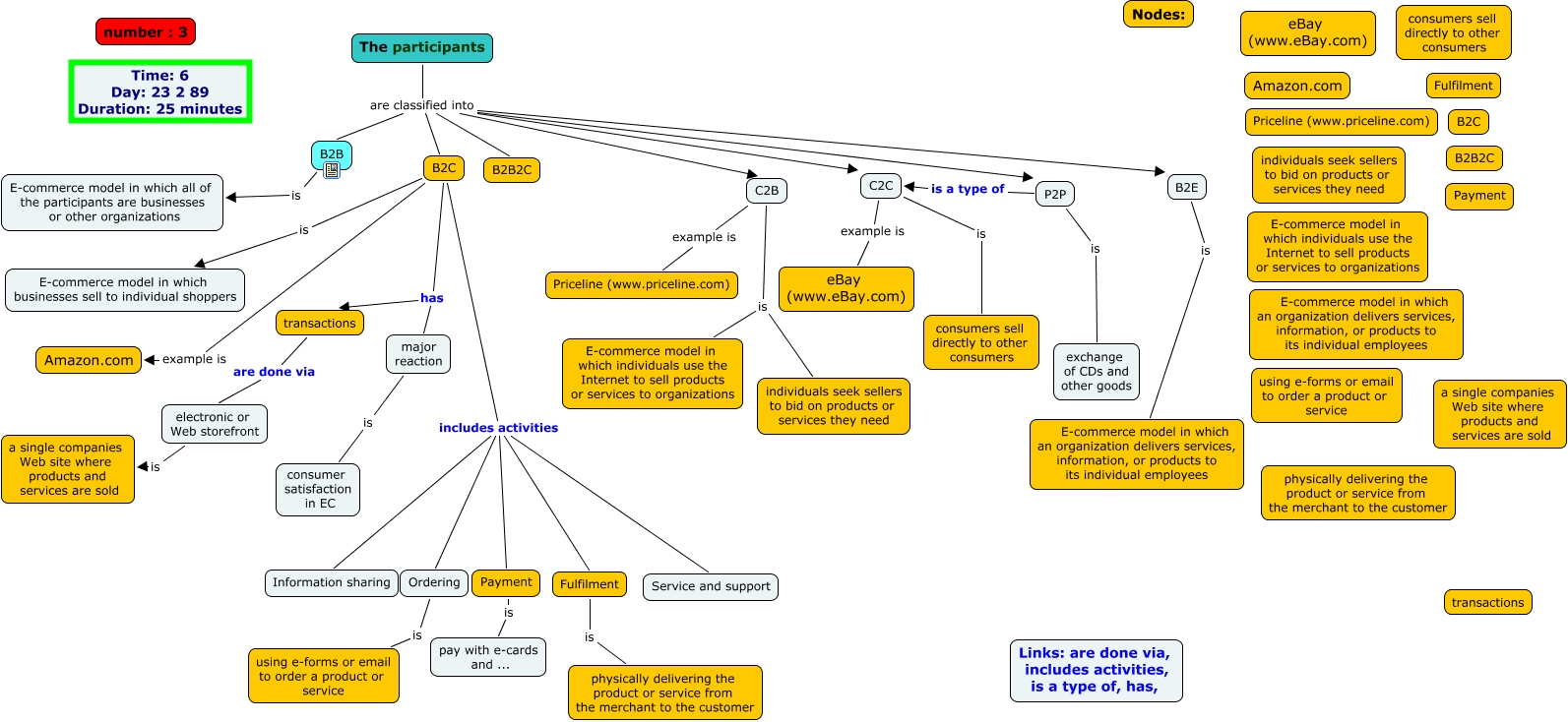 This Concept Map, created with IHMC CmapTools, has information related to: EC categories by the participants, C2B is E-commerce model in which individuals use the Internet to sell products or services to organizations, C2C example is eBay (www.eBay.com), B2C includes activities Service and support, P2P is a type of C2C, The participants are classified into B2C, B2C includes activities Payment, C2C is consumers sell directly to other consumers, The participants are classified into B2B, major reaction is consumer satisfaction in EC, B2C includes activities Ordering, B2B is E-commerce model in which all of the participants are businesses or other organizations, Fulfilment is physically delivering the product or service from the merchant to the customer, Ordering is using e-forms or email to order a product or service, electronic or Web storefront is a single companies Web site where products and services are sold, transactions are done via electronic or Web storefront, B2C includes activities Fulfilment, Payment is pay with e-cards and ..., B2C example is Amazon.com, C2B is individuals seek sellers to bid on products or services they need, The participants are classified into B2B2C