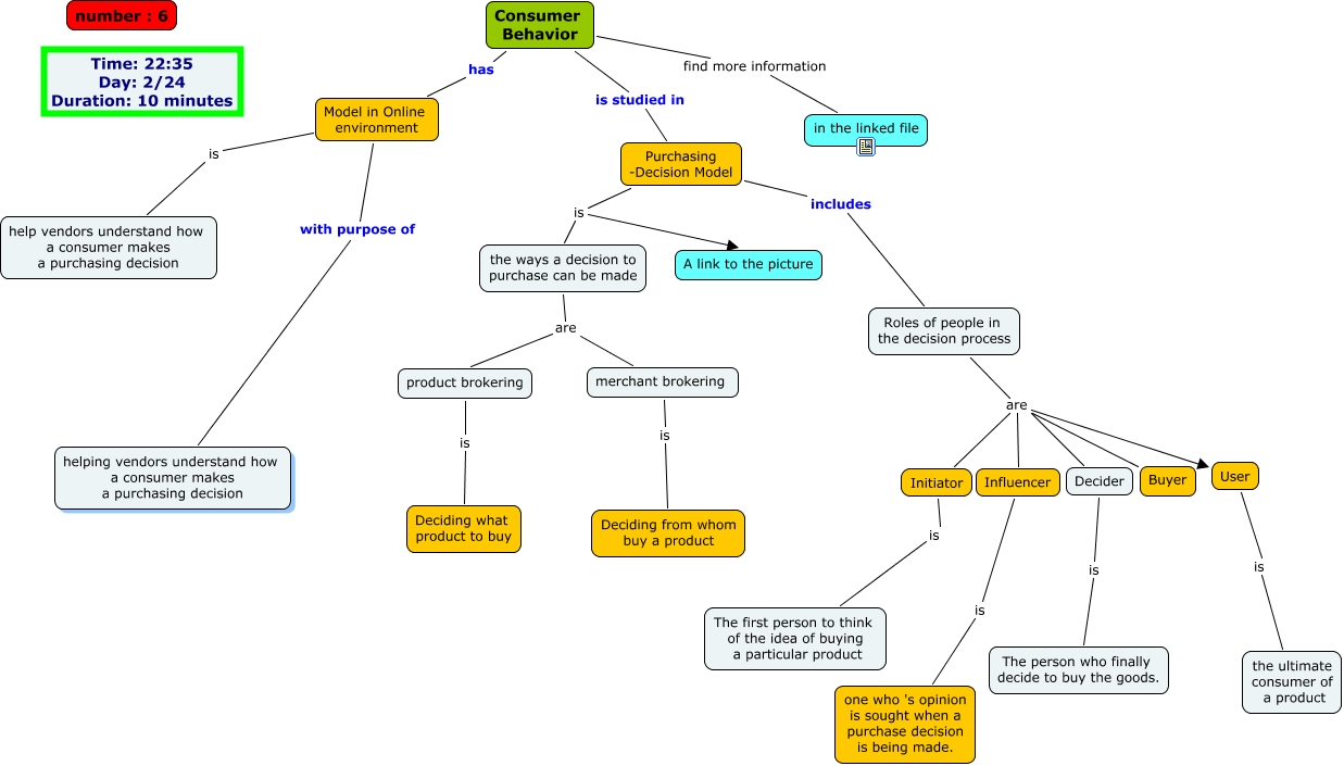 This Concept Map, created with IHMC CmapTools, has information related to: Consumer Behavior, Roles of people in the decision process are User, Influencer is one who 's opinion is sought when a purchase decision is being made., Purchasing -Decision Model is A link to the picture, Roles of people in the decision process are Decider, Roles of people in the decision process are Influencer, Consumer Behavior find more information in the linked file, User is the ultimate consumer of a product, Purchasing -Decision Model is the ways a decision to purchase can be made, Model in Online environment is help vendors understand how a consumer makes a purchasing decision, the ways a decision to purchase can be made are merchant brokering, Model in Online environment with purpose of helping vendors understand how a consumer makes a purchasing decision, Roles of people in the decision process are Buyer, product brokering is Deciding what product to buy, Decider is The person who finally decide to buy the goods., merchant brokering is Deciding from whom buy a product, the ways a decision to purchase can be made are product brokering, Roles of people in the decision process are Initiator, Consumer Behavior is studied in Purchasing -Decision Model, Initiator is The first person to think of the idea of buying a particular product, Consumer Behavior has Model in Online environment