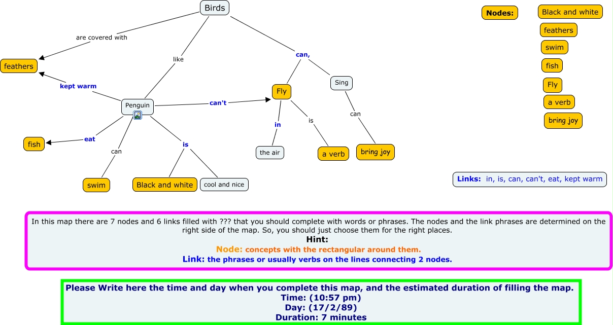 This Concept Map, created with IHMC CmapTools, has information related to: Pre Concept Map - Bird-Fatemi, Penguin is Black and white, Fly in the air, Penguin is cool and nice, Penguin eat fish, Birds are covered with feathers, Penguin can swim, Birds like Penguin, Sing can bring joy, Penguin can't Fly, Birds can, Sing, Fly is a verb, Penguin kept warm feathers, Birds can, Fly