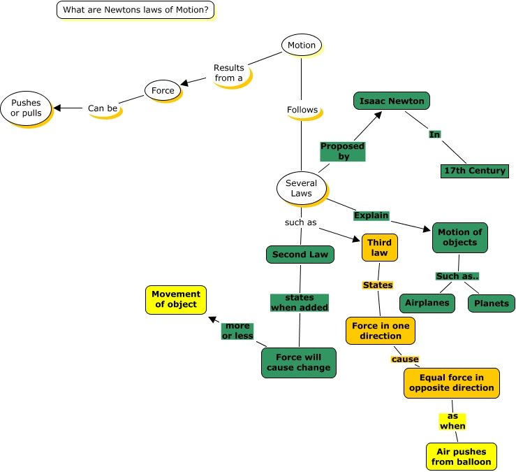 This Concept Map, created with IHMC CmapTools, has information related to: 635-637-030713-barry-nl, Motion Follows Several Laws, Third law States Force in one direction, Several Laws such as Third law, Force in one direction cause Equal force in opposite direction, Second Law states when added Force will cause change, Force will cause change more or less Movement of object, Isaac Newton In 17th Century, Motion of objects Such as.. Airplanes, Motion of objects Such as.. Planets, Force Can be Pushes or pulls, Several Laws such as Second Law, Several Laws Proposed by Isaac Newton, Several Laws Explain Motion of objects, Equal force in opposite direction as when Air pushes from balloon, Motion Results from a Force