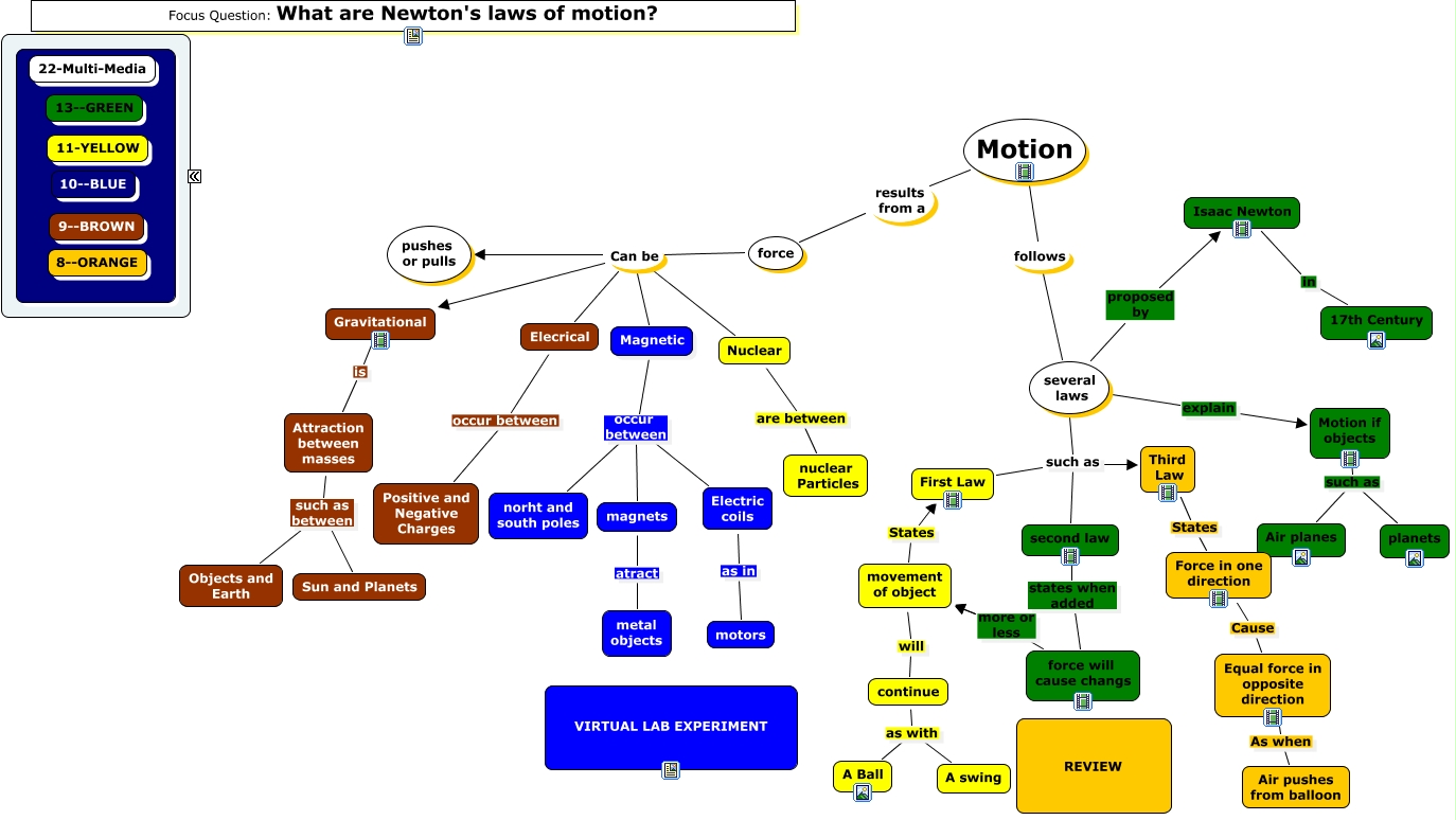 This Concept Map, created with IHMC CmapTools, has information related to: 030713-woodard-nl-635-637, Motion results from a force, Motion if objects such as planets, Attraction between masses such as between Objects and Earth, ???? 9--BROWN, force Can be Gravitational, Motion if objects such as Air planes, ???? 10--BLUE, Force in one direction Cause Equal force in opposite direction, force Can be Elecrical, First Law such as Third Law, ???? 8--ORANGE, movement of object will continue, Magnetic occur between Electric coils, Gravitational is Attraction between masses, First Law such as second law, Elecrical occur between Positive and Negative Charges, Isaac Newton in 17th Century, continue as with A swing, Electric coils as in motors, several laws explain Motion if objects