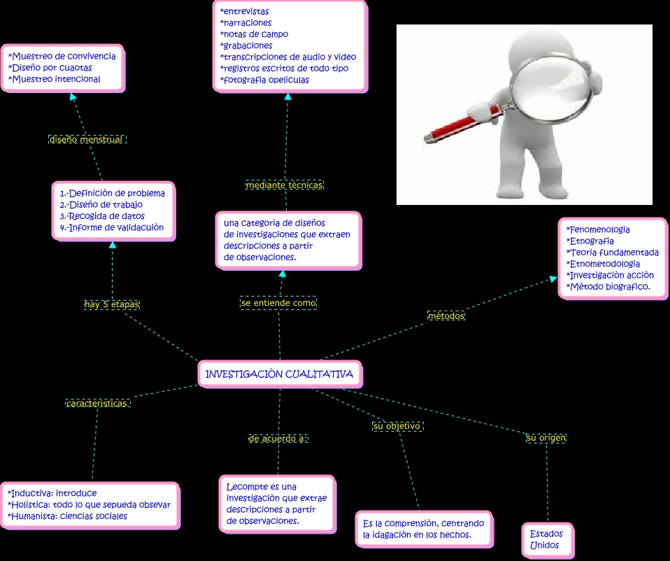 Este Cmap, tiene información relacionada con: INVESTIGACIÒN CUALITATIVA, INVESTIGACIÒN CUALITATIVA caracteristicas *Inductiva: introduce *Holistica: todo lo que sepueda obsevar *Humanista: ciencias sociales, INVESTIGACIÒN CUALITATIVA de acuerdo a: Lecompte es una investigaciòn que extrae descripciones a partir de observaciones., INVESTIGACIÒN CUALITATIVA su objetivo Es la comprensiòn, centrando la idagaciòn en los hechos., una categoria de diseños de investigaciones que extraen descripciones a partir de observaciones. mediante tècnicas *entrevistas *narraciones *notas de campo *grabaciones *transcripciones de audio y video *registros escritos de todo tipo *fotografia opeliculas, INVESTIGACIÒN CUALITATIVA se entiende como una categoria de diseños de investigaciones que extraen descripciones a partir de observaciones., INVESTIGACIÒN CUALITATIVA hay 5 etapas 1.-Definiciòn de problema 2.-Diseño de trabajo 3.-Recogida de datos 4.-Informe de validacuiòn, INVESTIGACIÒN CUALITATIVA mètodos *Fenomenologia *Etnografia *Teoria fundamentada *Etnometodologia *Investigaciòn acciòn *Mètodo biografico., 1.-Definiciòn de problema 2.-Diseño de trabajo 3.-Recogida de datos 4.-Informe de validacuiòn diseño menstrual *Muestreo de convivencia *Diseño por cuaotas *Muestreo intencional, INVESTIGACIÒN CUALITATIVA su origen Estados Unidos