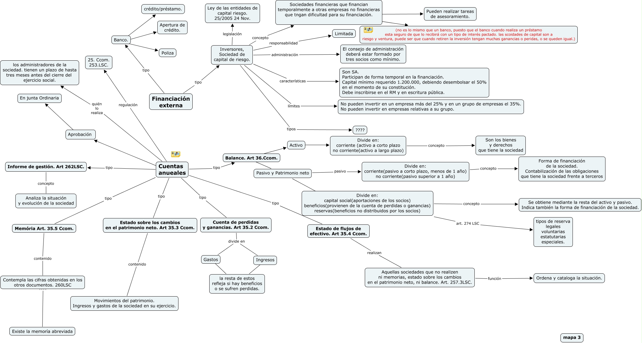 Este Cmap, tiene información relacionada con: caso practico tercero, Pasivo y Patrimonio neto Patrimonio neto Divide en: capital social(aportaciones de los socios) beneficios(provienen de la cuenta de perdidas o ganancias) reservas(beneficios no distribuidos por los socios), Gastos ???? la resta de estos refleja si hay beneficios o se sufren perdidas., Aprobación ???? En junta Ordinaria, Inversores, Sociedad de capital de riesgo. tipos ????, Cuenta de perdidas y ganancias. Art 35.2 Ccom. divide en Gastos, Cuentas anueales regulación 25. Ccom. 253.LSC., Financiación externa tipo Banco., Cuentas anueales tipo Cuenta de perdidas y ganancias. Art 35.2 Ccom., Divide en: capital social(aportaciones de los socios) beneficios(provienen de la cuenta de perdidas o ganancias) reservas(beneficios no distribuidos por los socios) concepto Se obtiene mediante la resta del activo y pasivo. Indica también la forma de financiación de la sociedad., Sociedades financieras que financian temporalmente a otras empresas no financieras que tngan dificultad para su financiación. ???? (no es lo mismo que un banco, puesto que el banco cuando realiza un préstamo esta seguro de que lo recibirá con un tipo de interés pactado. las scoidades de capital son a riesgo y ventura, puede ser que cuando retiren la inversión tengan muchas ganancias o peridas, o se queden igual.), Divide en: capital social(aportaciones de los socios) beneficios(provienen de la cuenta de perdidas o ganancias) reservas(beneficios no distribuidos por los socios) art. 274 LSC tipos de reserva legales voluntarias estatutarias especiales., Cuenta de perdidas y ganancias. Art 35.2 Ccom. divide en Ingresos, Banco. ???? Apertura de crédito., Estado sobre los cambios en el patrimonio neto. Art 35.3 Ccom. contenido Movimientos del patrimonio. Ingresos y gastos de la sociedad en su ejercicio., Pasivo y Patrimonio neto pasivo Divide en: corriente(pasivo a corto plazo, menos de 1 año) no corriente(pasivo superior a 1 año), Inversores, Sociedad de capital de riesgo. características Son SA. Participan de forma temporal en la financiación. Capital mínimo requerido 1.200.000, debiendo desembolsar el 50% en el momento de su constitución. Debe inscribirse en el RM y en escritura pública., Balance. Art 36.Ccom. ???? Pasivo y Patrimonio neto, Inversores, Sociedad de capital de riesgo. legislación Ley de las entidades de capital riesgo. 25/2005 24 Nov., Banco. ???? Poliza, Balance. Art 36.Ccom. ???? Activo