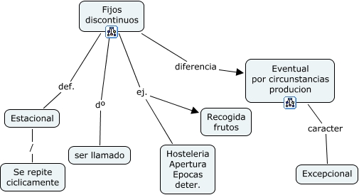 Este Cmap, tiene información relacionada con: Tema 2 Contrato de Trabajo Fijo discontinuo, Fijos discontinuos ej. Recogida frutos, Fijos discontinuos diferencia Eventual por circunstancias producion, Fijos discontinuos def. Estacional, Eventual por circunstancias producion caracter Excepcional, Estacional / Se repite ciclicamente, Fijos discontinuos ej. Hosteleria Apertura Epocas deter., Fijos discontinuos dº ser llamado
