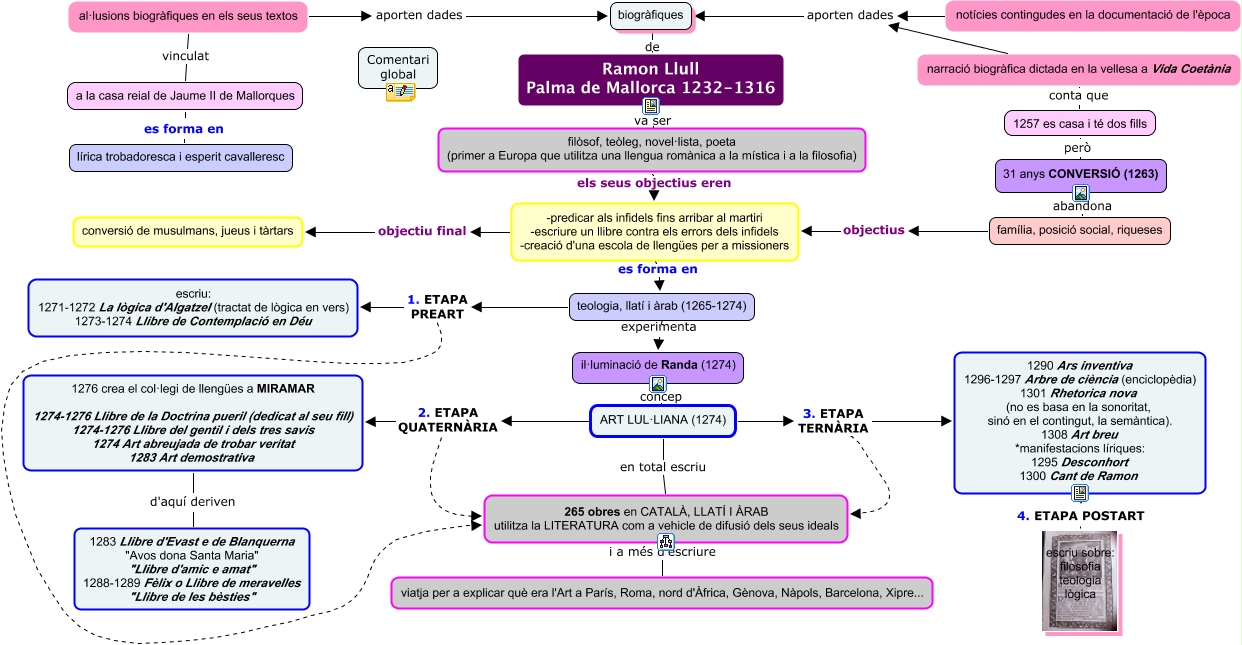 Aquest mapa conceptual conté informació relacionada amb: act4_eharo_Ramon Llull, viatja per a explicar què era l'Art a París, Roma, nord d'Àfrica, Gènova, Nàpols, Barcelona, Xipre... i a més d'escriure 265 obres en CATALÀ, LLATÍ I ÀRAB utilitza la LITERATURA com a vehicle de difusió dels seus ideals, al·lusions biogràfiques en els seus textos aporten dades biogràfiques, biogràfiques de Ramon Llull Palma de Mallorca 1232-1316, 1257 es casa i té dos fills conta que narració biogràfica dictada en la vellesa a Vida Coetània, 265 obres en CATALÀ, LLATÍ I ÀRAB utilitza la LITERATURA com a vehicle de difusió dels seus ideals en total escriu ART LUL·LIANA (1274), 1283 Llibre d'Evast e de Blanquerna "Avos dona Santa Maria" "Llibre d'amic e amat" 1288-1289 Fèlix o Llibre de meravelles "Llibre de les bèsties" d'aquí deriven 1276 crea el col·legi de llengües a MIRAMAR 1274-1276 Llibre de la Doctrina pueril (dedicat al seu fill) 1274-1276 Llibre del gentil i dels tres savis 1274 Art abreujada de trobar veritat 1283 Art demostrativa, ART LUL·LIANA (1274) 2. ETAPA QUATERNÀRIA 265 obres en CATALÀ, LLATÍ I ÀRAB utilitza la LITERATURA com a vehicle de difusió dels seus ideals, teologia, llatí i àrab (1265-1274) 1. ETAPA PREART 265 obres en CATALÀ, LLATÍ I ÀRAB utilitza la LITERATURA com a vehicle de difusió dels seus ideals, teologia, llatí i àrab (1265-1274) 1. ETAPA PREART escriu: 1271-1272 La lògica d'Algatzel (tractat de lògica en vers) 1273-1274 Llibre de Contemplació en Déu, filòsof, teòleg, novel·lista, poeta (primer a Europa que utilitza una llengua romànica a la mística i a la filosofia) els seus objectius eren -predicar als infidels fins arribar al martiri -escriure un llibre contra els errors dels infidels -creació d'una escola de llengües per a missioners, narració biogràfica dictada en la vellesa a Vida Coetània aporten dades biogràfiques, ART LUL·LIANA (1274) 3. ETAPA TERNÀRIA 1290 Ars inventiva 1296-1297 Arbre de ciència (enciclopèdia) 1301 Rhetorica nova (no es basa en la sonoritat, sinó en el contingut, la semàntica). 1308 Art breu *manifestacions líriques: 1295 Desconhort 1300 Cant de Ramon, família, posició social, riqueses abandona 31 anys CONVERSIÓ (1263), filòsof, teòleg, novel·lista, poeta (primer a Europa que utilitza una llengua romànica a la mística i a la filosofia) va ser Ramon Llull Palma de Mallorca 1232-1316, a la casa reial de Jaume II de Mallorques vinculat al·lusions biogràfiques en els seus textos, ART LUL·LIANA (1274) 3. ETAPA TERNÀRIA 265 obres en CATALÀ, LLATÍ I ÀRAB utilitza la LITERATURA com a vehicle de difusió dels seus ideals, família, posició social, riqueses objectius -predicar als infidels fins arribar al martiri -escriure un llibre contra els errors dels infidels -creació d'una escola de llengües per a missioners, -predicar als infidels fins arribar al martiri -escriure un llibre contra els errors dels infidels -creació d'una escola de llengües per a missioners objectiu final conversió de musulmans, jueus i tàrtars, lírica trobadoresca i esperit cavalleresc es forma en a la casa reial de Jaume II de Mallorques, 1290 Ars inventiva 1296-1297 Arbre de ciència (enciclopèdia) 1301 Rhetorica nova (no es basa en la sonoritat, sinó en el contingut, la semàntica). 1308 Art breu *manifestacions líriques: 1295 Desconhort 1300 Cant de Ramon 4. ETAPA POSTART escriu sobre: filosofia teologia lògica