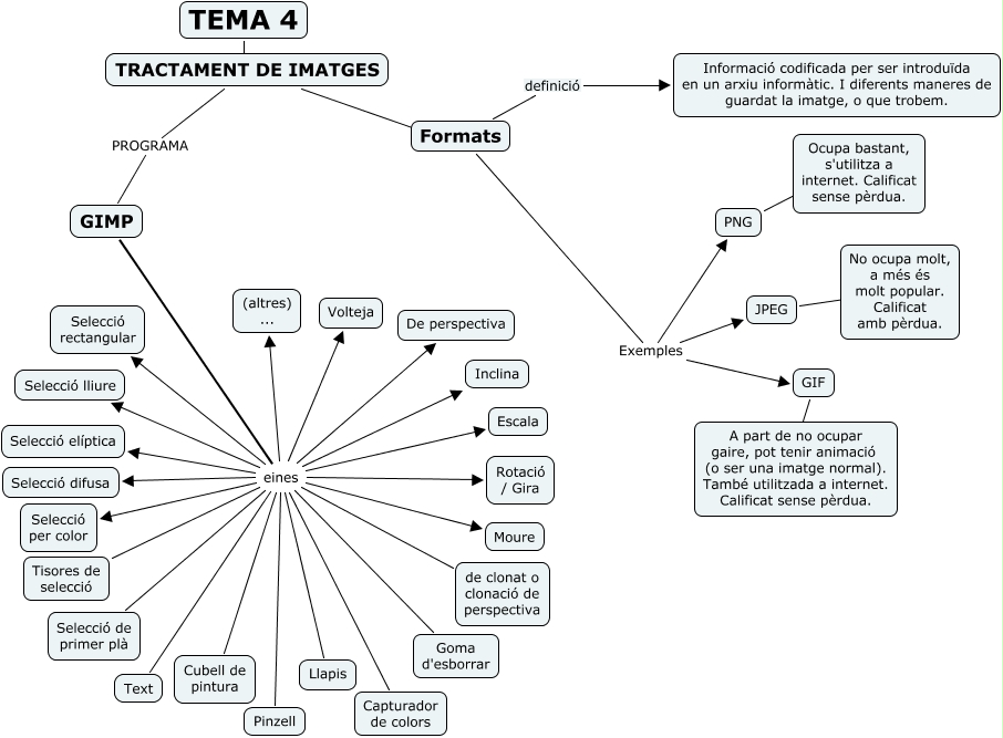 Aquest mapa conceptual conté informació relacionada amb: TEMA 4, GIMP eines De perspectiva, JPEG ???? No ocupa molt, a més és molt popular. Calificat amb pèrdua., TRACTAMENT DE IMATGES ???? Formats, GIMP eines Selecció per color, GIMP eines Text, PNG ???? Ocupa bastant, s'utilitza a internet. Calificat sense pèrdua., GIMP eines Llapis, GIMP eines de clonat o clonació de perspectiva, GIMP eines Tisores de selecció, GIMP eines Selecció lliure, GIMP eines Cubell de pintura, GIMP eines Selecció de primer plà, GIMP eines Goma d'esborrar, TRACTAMENT DE IMATGES PROGRAMA GIMP, Formats definició Informació codificada per ser introduïda en un arxiu informàtic. I diferents maneres de guardat la imatge, o que trobem., Formats Exemples PNG, GIMP eines Moure, TEMA 4 ???? TRACTAMENT DE IMATGES, GIMP eines Inclina, GIMP eines Escala