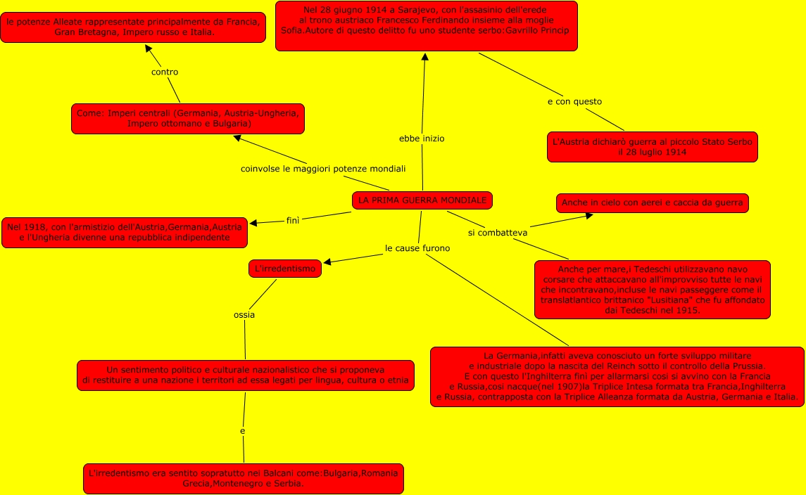 Questa Cmap, creata con IHMC CmapTools, contiene informazioni relative a: La Prima Guerra Mondiale, LA PRIMA GUERRA MONDIALE si combatteva Anche in cielo con aerei e caccia da guerra, LA PRIMA GUERRA MONDIALE si combatteva Anche per mare,i Tedeschi utilizzavano navo corsare che attaccavano all'improvviso tutte le navi che incontravano,incluse le navi passeggere come il translatlantico brittanico "Lusitiana" che fu affondato dai Tedeschi nel 1915., LA PRIMA GUERRA MONDIALE le cause furono La Germania,infatti aveva conosciuto un forte sviluppo militare e industriale dopo la nascita del Reinch sotto il controllo della Prussia. E con questo l'Inghilterra finì per allarmarsi cosi si avvino con la Francia e Russia,cosi nacque(nel 1907)la Triplice Intesa formata tra Francia,Inghilterra e Russia, contrapposta con la Triplice Alleanza formata da Austria, Germania e Italia., LA PRIMA GUERRA MONDIALE coinvolse le maggiori potenze mondiali Come: Imperi centrali (Germania, Austria-Ungheria, Impero ottomano e Bulgaria), Come: Imperi centrali (Germania, Austria-Ungheria, Impero ottomano e Bulgaria) contro le potenze Alleate rappresentate principalmente da Francia, Gran Bretagna, Impero russo e Italia., Nel 28 giugno 1914 a Sarajevo, con l'assasinio dell'erede al trono austriaco Francesco Ferdinando insieme alla moglie Sofia.Autore di questo delitto fu uno studente serbo:Gavrillo Princip e con questo L'Austria dichiarò guerra al piccolo Stato Serbo il 28 luglio 1914, LA PRIMA GUERRA MONDIALE ebbe inizio Nel 28 giugno 1914 a Sarajevo, con l'assasinio dell'erede al trono austriaco Francesco Ferdinando insieme alla moglie Sofia.Autore di questo delitto fu uno studente serbo:Gavrillo Princip, Un sentimento politico e culturale nazionalistico che si proponeva di restituire a una nazione i territori ad essa legati per lingua, cultura o etnia e L'irredentismo era sentito sopratutto nei Balcani come:Bulgaria,Romania Grecia,Montenegro e Serbia., L'irredentismo ossia Un sentimento politico e culturale nazionalistico che si proponeva di restituire a una nazione i territori ad essa legati per lingua, cultura o etnia, LA PRIMA GUERRA MONDIALE le cause furono L'irredentismo, LA PRIMA GUERRA MONDIALE finì Nel 1918, con l'armistizio dell'Austria,Germania,Austria e l'Ungheria divenne una repubblica indipendente