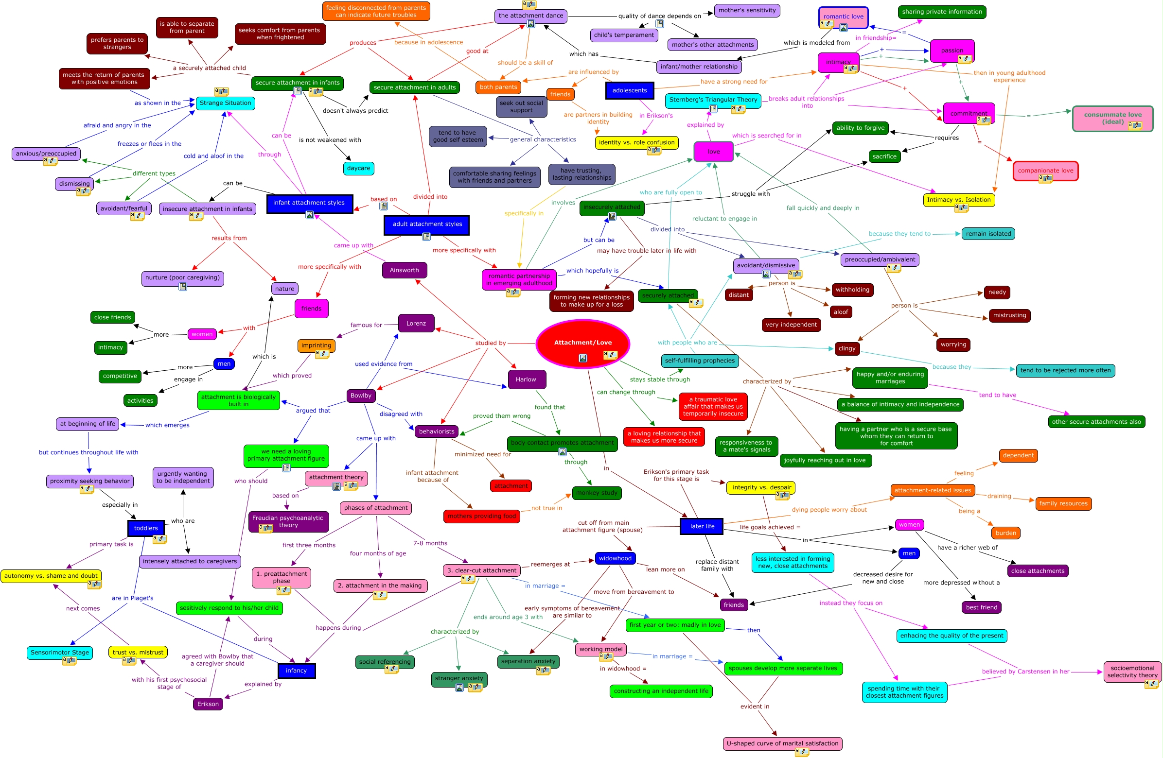 This Concept Map, created with IHMC CmapTools, has information related to: Reitsma S, adolescents have a strong need for intimacy, secure attachment in infants doesn't always predict secure attachment in adults, 3. clear-cut attachment ends around age 3 with working model, securely attached characterized by responsiveness to a mate's signals, adult attachment styles more specifically with romantic partnership in emerging adulthood, friends with men, attachment-related issues being a burden, widowhood move from bereavement to working model, infancy explained by Erikson, Sternberg's Triangular Theory breaks adult relationships into commitment, imprinting which proved attachment is biologically built in, body contact promotes attachment proved them wrong behaviorists, adult attachment styles more specifically with friends, Sternberg's Triangular Theory breaks adult relationships into passion, body contact promotes attachment through monkey study, secure attachment in infants is not weakened with daycare, later life cut off from main attachment figure (spouse) widowhood, men more competitive, Attachment/Love studied by behaviorists, Attachment/Love studied by Lorenz