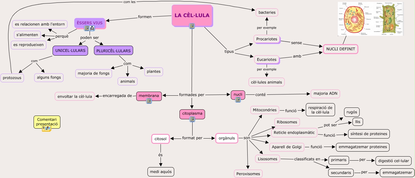 Aquest mapa conceptual conté informació relacionada amb: La cèl·lula 3r cicle EP amb recursos i presentació, Reticle endoplasmàtic pot ser llis, ÈSSERS VIUS poden ser UNICEL·LULARS, LA CÈL·LULA tipus Eucariotes, Mitocondries funció respiració de la cèl·lula, citoplasma format per citosol, NUCLI DEFINIT ????, citosol és medi aquós, nucli conté majoria ADN, LA CÈL·LULA formades per membrana, PLURICÈL·LULARS com majoria de fongs, Procariotes sense NUCLI DEFINIT, PLURICÈL·LULARS com animals, Aparell de Golgi funció emmagatzemar proteines, PLURICÈL·LULARS com plantes, Reticle endoplasmàtic funció síntesi de proteines, secundaris per emmagatzemar, ÈSSERS VIUS perquè es reprodueixen, orgànuls son Ribosomes, orgànuls son Aparell de Golgi, Lisosomes classificats en secundaris
