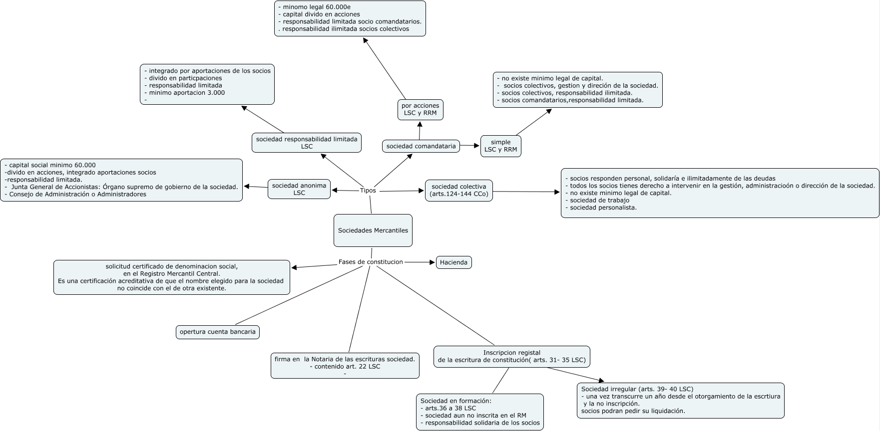 Este Cmap, tiene información relacionada con: escenario 1, sociedad colectiva (arts.124-144 CCo) ???? - socios responden personal, solidaría e ilimitadamente de las deudas - todos los socios tienes derecho a intervenir en la gestión, administracioón o dirección de la sociedad. - no existe minimo legal de capital. - sociedad de trabajo - sociedad personalista., Sociedades Mercantiles Fases de constitucion solicitud certificado de denominacion social, en el Registro Mercantil Central. Es una certificación acreditativa de que el nombre elegido para la sociedad no coincide con el de otra existente., sociedad responsabilidad limitada LSC ???? - integrado por aportaciones de los socios - divido en particpaciones - responsabilidad limitada - minimo aportacion 3.000 -, Sociedades Mercantiles Tipos sociedad responsabilidad limitada LSC, Sociedades Mercantiles Tipos sociedad colectiva (arts.124-144 CCo), simple LSC y RRM ???? - no existe minimo legal de capital. - socios colectivos, gestion y direción de la sociedad. - socios colectivos, responsabilidad ilimitada. - socios comandatarios,responsabilidad limitada., sociedad comandataria ???? simple LSC y RRM, Sociedades Mercantiles Tipos sociedad comandataria, Sociedades Mercantiles Fases de constitucion opertura cuenta bancaria, sociedad comandataria ???? por acciones LSC y RRM, Inscripcion registal de la escritura de constitución( arts. 31- 35 LSC) ???? Sociedad en formación: - arts.36 a 38 LSC - sociedad aun no inscrita en el RM - responsabilidad solidaria de los socios, Sociedades Mercantiles Fases de constitucion firma en la Notaria de las escrituras sociedad. - contenido art. 22 LSC -, Sociedades Mercantiles Tipos sociedad anonima LSC, Sociedades Mercantiles Fases de constitucion Inscripcion registal de la escritura de constitución( arts. 31- 35 LSC), sociedad anonima LSC ???? - capital social minimo 60.000 -divido en acciones, integrado aportaciones socios -responsabilidad limitada. - Junta General de Accionistas: Órgano supremo de gobierno de la sociedad. - Consejo de Administración o Administradores, por acciones LSC y RRM ???? - minomo legal 60.000e - capital divido en acciones - responsabilidad limitada socio comandatarios. . responsabilidad ilimitada socios colectivos, Sociedades Mercantiles Fases de constitucion Hacienda, Inscripcion registal de la escritura de constitución( arts. 31- 35 LSC) ???? Sociedad irregular (arts. 39- 40 LSC) - una vez transcurre un año desde el otorgamiento de la escrtiura y la no inscripción. socios podran pedir su liquidación.