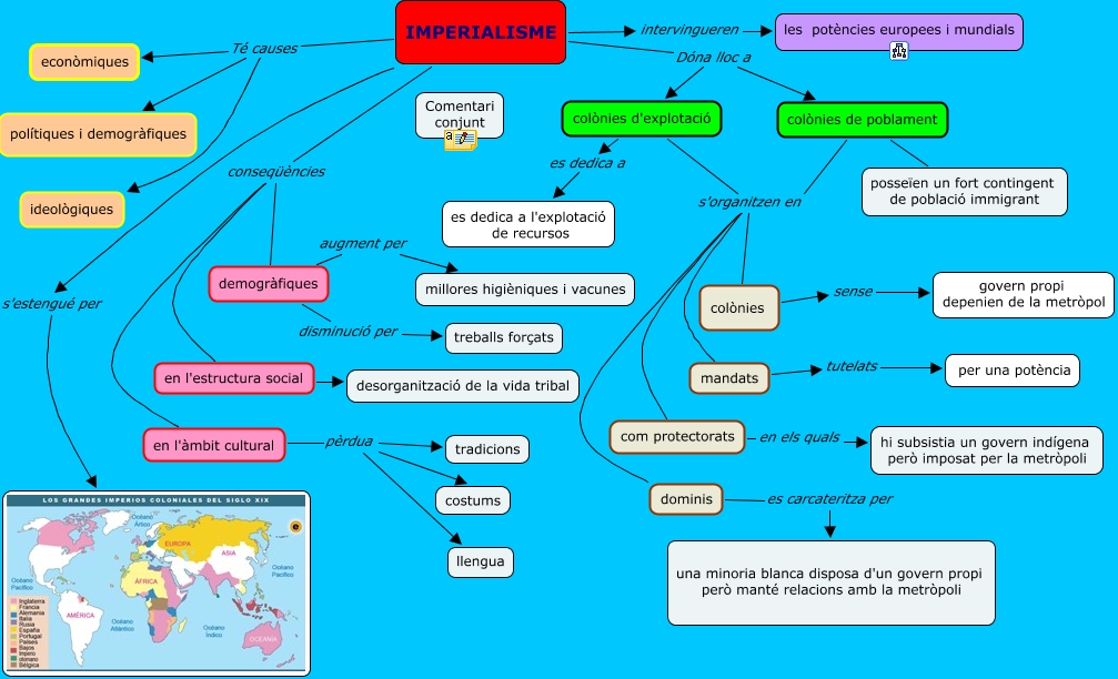 Aquest mapa conceptual conté informació relacionada amb: Imperialisme_3, IMPERIALISME Dóna lloc a colònies de poblament, en l'àmbit cultural pèrdua tradicions, IMPERIALISME conseqüències en l'àmbit cultural, dominis es carcateritza per una minoria blanca disposa d'un govern propi però manté relacions amb la metròpoli, colònies d'explotació s'organitzen en colònies, IMPERIALISME Té causes econòmiques, en l'àmbit cultural pèrdua llengua, IMPERIALISME Té causes ideològiques, IMPERIALISME conseqüències en l'estructura social, com protectorats en els quals hi subsistia un govern indígena però imposat per la metròpoli, IMPERIALISME s'estengué per, IMPERIALISME Té causes polítiques i demogràfiques, colònies de poblament s'organitzen en dominis, IMPERIALISME Dóna lloc a colònies d'explotació, colònies d'explotació es dedica a es dedica a l'explotació de recursos, IMPERIALISME intervingueren les potències europees i mundials, colònies de poblament s'organitzen en colònies, demogràfiques disminució per treballs forçats, colònies de poblament s'organitzen en mandats, colònies de poblament posseïen un fort contingent de població immigrant