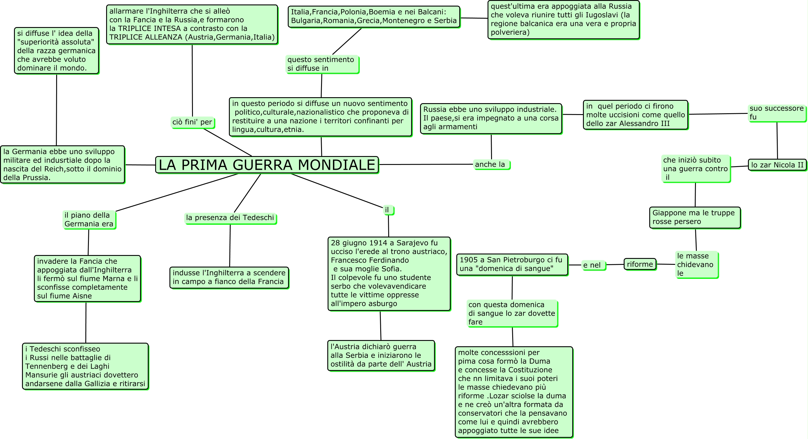 Questa Cmap, creata con IHMC CmapTools, contiene informazioni relative a: prima guerra mondiale, si diffuse l' idea della "superiorità assoluta" della razza germanica che avrebbe voluto dominare il mondo. ???? la Germania ebbe uno sviluppo militare ed indusrtiale dopo la nascita del Reich,sotto il dominio della Prussia., in questo periodo si diffuse un nuovo sentimento politico,culturale,nazionalistico che proponeva di restituire a una nazione i territori confinanti per lingua,cultura,etnia. questo sentimento si diffuse in Italia,Francia,Polonia,Boemia e nei Balcani: Bulgaria,Romania,Grecia,Montenegro e Serbia, LA PRIMA GUERRA MONDIALE il 28 giugno 1914 a Sarajevo fu ucciso l'erede al trono austriaco, Francesco Ferdinando e sua moglie Sofia. Il colpevole fu uno studente serbo che volevavendicare tutte le vittime oppresse all'impero asburgo, Russia ebbe uno sviluppo industriale. Il paese,si era impegnato a una corsa agli armamenti ???? in quel periodo ci firono molte uccisioni come quello dello zar Alessandro III, LA PRIMA GUERRA MONDIALE anche la Russia ebbe uno sviluppo industriale. Il paese,si era impegnato a una corsa agli armamenti, invadere la Fancia che appoggiata dall'Inghilterra li fermò sul fiume Marna e li sconfisse completamente sul fiume Aisne ???? i Tedeschi sconfisseo i Russi nelle battaglie di Tennenberg e dei Laghi Mansurie gli austriaci dovettero andarsene dalla Gallizia e ritirarsi, LA PRIMA GUERRA MONDIALE il piano della Germania era invadere la Fancia che appoggiata dall'Inghilterra li fermò sul fiume Marna e li sconfisse completamente sul fiume Aisne, 28 giugno 1914 a Sarajevo fu ucciso l'erede al trono austriaco, Francesco Ferdinando e sua moglie Sofia. Il colpevole fu uno studente serbo che volevavendicare tutte le vittime oppresse all'impero asburgo ???? l'Austria dichiarò guerra alla Serbia e iniziarono le ostilità da parte dell' Austria, LA PRIMA GUERRA MONDIALE la presenza dei Tedeschi indusse l'Inghilterra a scendere in campo a fianco della Francia, lo zar Nicola II che iniziò subito una guerra contro il Giappone ma le truppe rosse persero, LA PRIMA GUERRA MONDIALE ???? in questo periodo si diffuse un nuovo sentimento politico,culturale,nazionalistico che proponeva di restituire a una nazione i territori confinanti per lingua,cultura,etnia., 1905 a San Pietroburgo ci fu una "domenica di sangue" con questa domenica di sangue lo zar dovette fare molte concesssioni per pima cosa formò la Duma e concesse la Costituzione che nn limitava i suoi poteri le masse chiedevano più riforme .Lozar sciolse la duma e ne creò un'altra formata da conservatori che la pensavano come lui e quindi avrebbero appoggiato tutte le sue idee, LA PRIMA GUERRA MONDIALE la Germania ebbe uno sviluppo militare ed indusrtiale dopo la nascita del Reich,sotto il dominio della Prussia., LA PRIMA GUERRA MONDIALE ciò fini' per allarmare l'Inghilterra che si alleò con la Fancia e la Russia,e formarono la TRIPLICE INTESA a contrasto con la TRIPLICE ALLEANZA (Austria,Germania,Italia), in quel periodo ci firono molte uccisioni come quello dello zar Alessandro III suo successore fu lo zar Nicola II, Italia,Francia,Polonia,Boemia e nei Balcani: Bulgaria,Romania,Grecia,Montenegro e Serbia ???? quest'ultima era appoggiata alla Russia che voleva riunire tutti gli Iugoslavi (la regione balcanica era una vera e propria polveriera), riforme e nel 1905 a San Pietroburgo ci fu una "domenica di sangue", Giappone ma le truppe rosse persero le masse chidevano le riforme