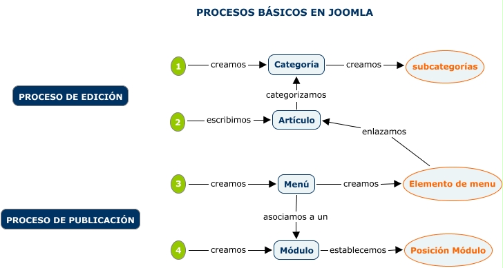 Este Cmap, tiene información relacionada con: 01_edicion_publicacion, Artículo categorizamos Categoría, Menú creamos Elemento de menu, Menú asociamos a un Módulo, Categoría creamos subcategorías, 4 creamos Módulo, Elemento de menu enlazamos Artículo, 1 creamos Categoría, 2 escribimos Artículo, Módulo establecemos Posición Módulo, 3 creamos Menú