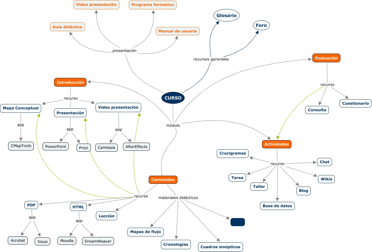 Este Cmap, tiene información relacionada con: curso_planificacion, Actividades recurso Blog, PDF app Issue, Contenidos recurso Presentación, CURSO módulo Evaluación, Introducción recurso Presentación, CURSO recursos generales Glosario, Evaluación recurso Consulta, HTML app Moodle, Video presentación app AfterEffects, Actividades recurso Chat, Actividades recurso Tarea, Contenidos recurso Lección, Mapa Conceptual app CMapTools, Actividades recurso Wikis, Presentación app Prezi, Introducción recurso Video presentación, CURSO módulo Contenidos, Actividades recurso Taller, CURSO presentación Video presentación, Actividades recurso Base de datos