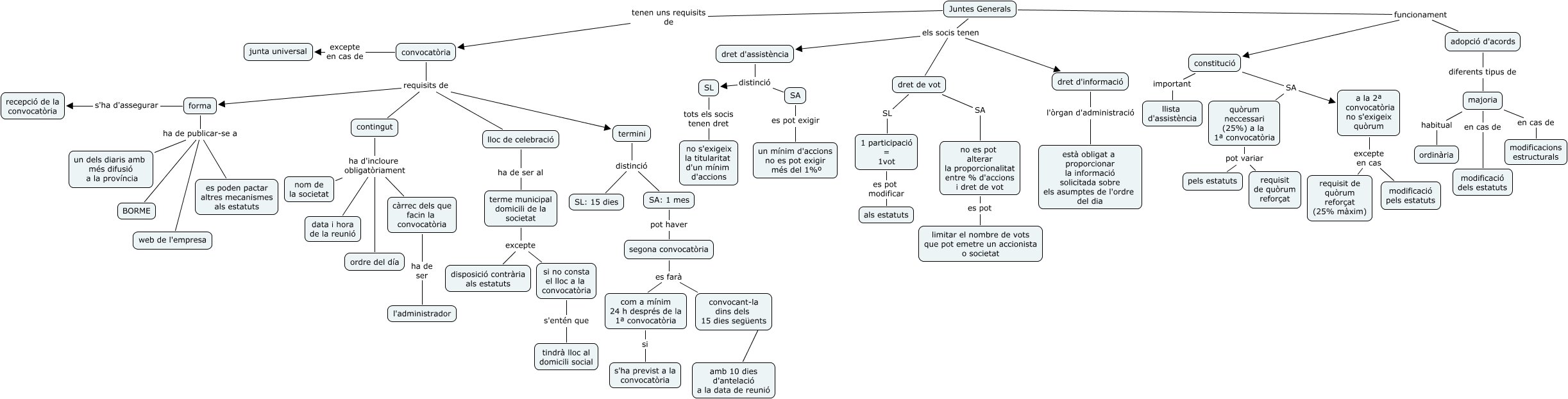 Este Cmap, tiene información relacionada con: mapa 3, majoria en cas de modificació dels estatuts, convocatòria requisits de forma, dret de vot SA no es pot alterar la proporcionalitat entre % d'accions i dret de vot, adopció d'acords diferents tipus de majoria, lloc de celebració ha de ser al terme municipal domicili de la societat, segona convocatòria es farà com a mínim 24 h després de la 1ª convocatòria, com a mínim 24 h després de la 1ª convocatòria si s'ha previst a la convocatòria, dret d'assistència distinció SA, no es pot alterar la proporcionalitat entre % d'accions i dret de vot es pot limitar el nombre de vots que pot emetre un accionista o societat, càrrec dels que facin la convocatòria ha de ser l'administrador, dret d'informació l'òrgan d'administració està obligat a proporcionar la informació solicitada sobre els asumptes de l'ordre del dia, contingut ha d'incloure obligatòriament ordre del día, convocatòria requisits de termini, dret de vot SL 1 participació = 1vot, SA: 1 mes pot haver segona convocatòria, convocatòria requisits de lloc de celebració, contingut ha d'incloure obligatòriament càrrec dels que facin la convocatòria, a la 2ª convocatòria no s'exigeix quòrum excepte en cas requisit de quòrum reforçat (25% màxim), Juntes Generals tenen uns requisits de convocatòria, constitució SA quòrum neccessari (25%) a la 1ª convocatòria