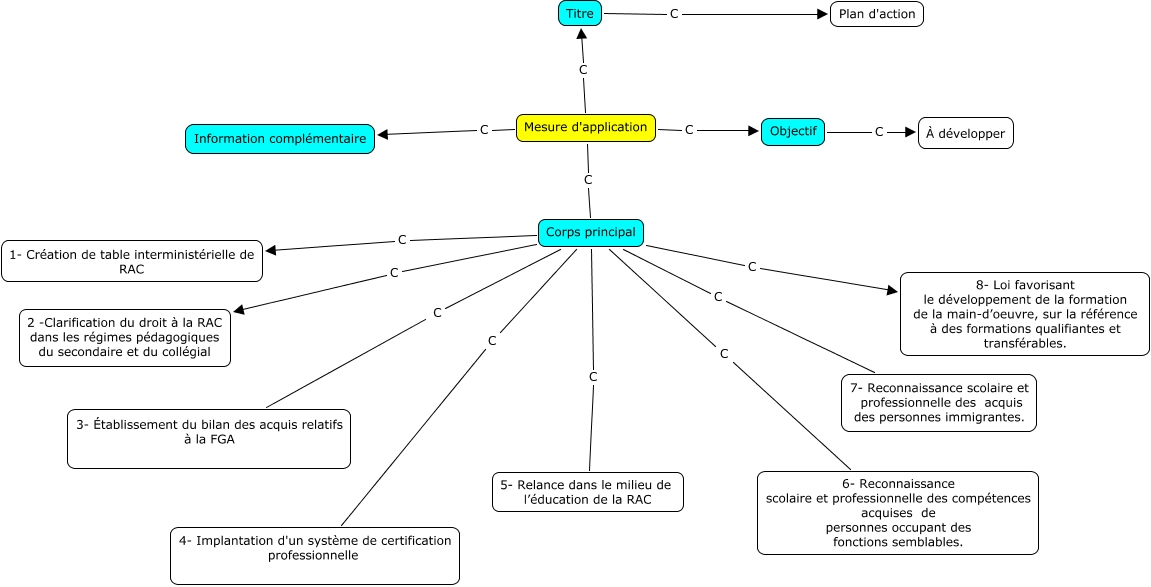 Cette carte de concepts créée avec IHMC CmapTools traite de: Ress mes, Mesure d'application C Information complémentaire, Corps principal C 1- Création de table interministérielle de RAC, Corps principal C 2 -Clarification du droit à la RAC dans les régimes pédagogiques du secondaire et du collégial, Titre C Plan d'action, Corps principal C 4- Implantation d'un système de certification professionnelle, Corps principal C 5- Relance dans le milieu de l’éducation de la RAC, Corps principal C 6- Reconnaissance scolaire et professionnelle des compétences acquises de personnes occupant des fonctions semblables., Mesure d'application C Corps principal, Corps principal C 7- Reconnaissance scolaire et professionnelle des acquis des personnes immigrantes., Corps principal C 8- Loi favorisant le développement de la formation de la main-d’oeuvre, sur la référence à des formations qualifiantes et transférables., Corps principal C 3- Établissement du bilan des acquis relatifs à la FGA, Objectif C À développer, Mesure d'application C Titre, Mesure d'application C Objectif