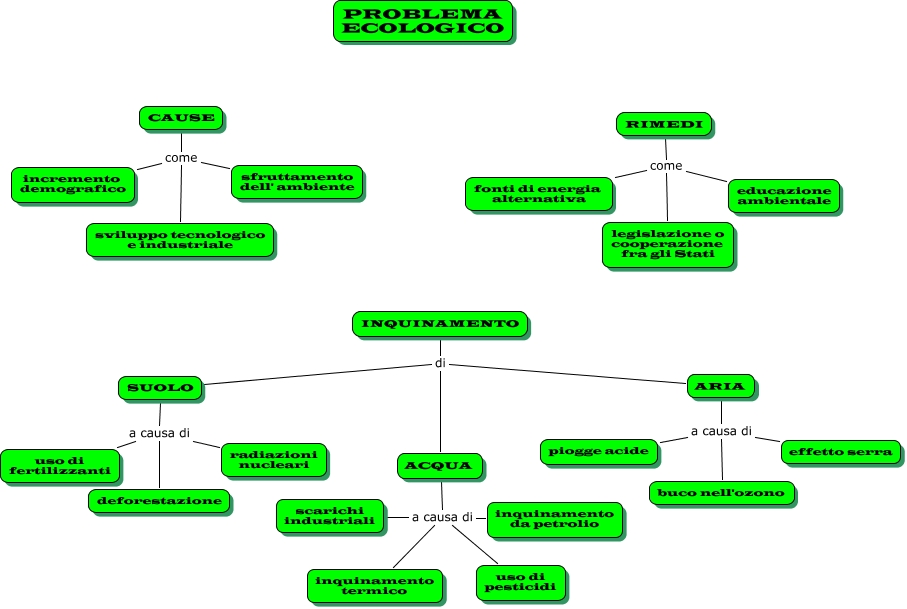 Questa Cmap, creata con IHMC CmapTools, contiene informazioni relative a: PROBLEMA ECOLOGICO - INQUINAMENTO, INQUINAMENTO di ARIA, ACQUA a causa di inquinamento da petrolio, SUOLO a causa di uso di fertilizzanti, CAUSE come sfruttamento dell' ambiente, ACQUA a causa di uso di pesticidi, SUOLO a causa di deforestazione, SUOLO a causa di radiazioni nucleari, RIMEDI come educazione ambientale, ACQUA a causa di scarichi industriali, INQUINAMENTO di ACQUA, ARIA a causa di buco nell'ozono, CAUSE come incremento demografico, ACQUA a causa di inquinamento termico, RIMEDI come legislazione o cooperazione fra gli Stati, INQUINAMENTO di SUOLO, RIMEDI come fonti di energia alternativa, CAUSE come sviluppo tecnologico e industriale, ARIA a causa di effetto serra, ARIA a causa di piogge acide