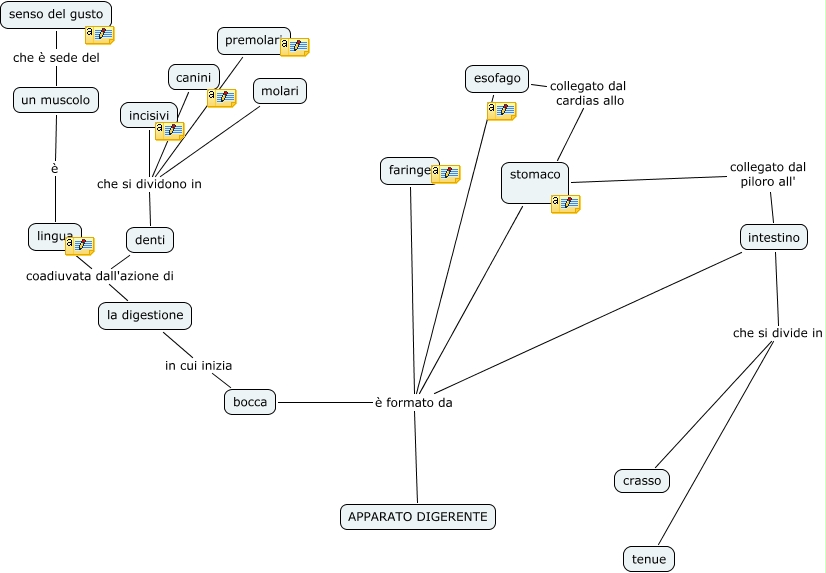 Questa Cmap, creata con IHMC CmapTools, contiene informazioni relative a: apparato digerente, stomaco collegato dal piloro all' intestino, la digestione coadiuvata dall'azione di denti, APPARATO DIGERENTE è formato da faringe, bocca in cui inizia la digestione, denti che si dividono in incisivi, lingua è un muscolo, APPARATO DIGERENTE è formato da esofago, APPARATO DIGERENTE è formato da stomaco, denti che si dividono in premolari, intestino che si divide in tenue, denti che si dividono in molari, APPARATO DIGERENTE è formato da intestino, esofago collegato dal cardias allo stomaco, un muscolo che è sede del senso del gusto, denti che si dividono in canini, APPARATO DIGERENTE è formato da bocca, la digestione coadiuvata dall'azione di lingua, intestino che si divide in crasso