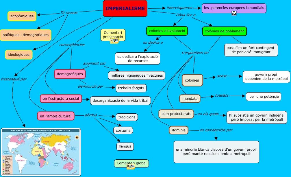 Aquest mapa conceptual conté informació relacionada amb: Imperialisme_3_presentació, IMPERIALISME Dóna lloc a colònies de poblament, en l'àmbit cultural pèrdua tradicions, IMPERIALISME conseqüències en l'àmbit cultural, dominis es carcateritza per una minoria blanca disposa d'un govern propi però manté relacions amb la metròpoli, colònies d'explotació s'organitzen en colònies, IMPERIALISME Té causes econòmiques, en l'àmbit cultural pèrdua llengua, IMPERIALISME Té causes ideològiques, IMPERIALISME conseqüències en l'estructura social, com protectorats en els quals hi subsistia un govern indígena però imposat per la metròpoli, IMPERIALISME s'estengué per, IMPERIALISME Té causes polítiques i demogràfiques, colònies de poblament s'organitzen en dominis, IMPERIALISME Dóna lloc a colònies d'explotació, colònies d'explotació es dedica a es dedica a l'explotació de recursos, IMPERIALISME intervingueren les potències europees i mundials, colònies de poblament s'organitzen en colònies, demogràfiques disminució per treballs forçats, colònies de poblament s'organitzen en mandats, colònies de poblament posseïen un fort contingent de població immigrant