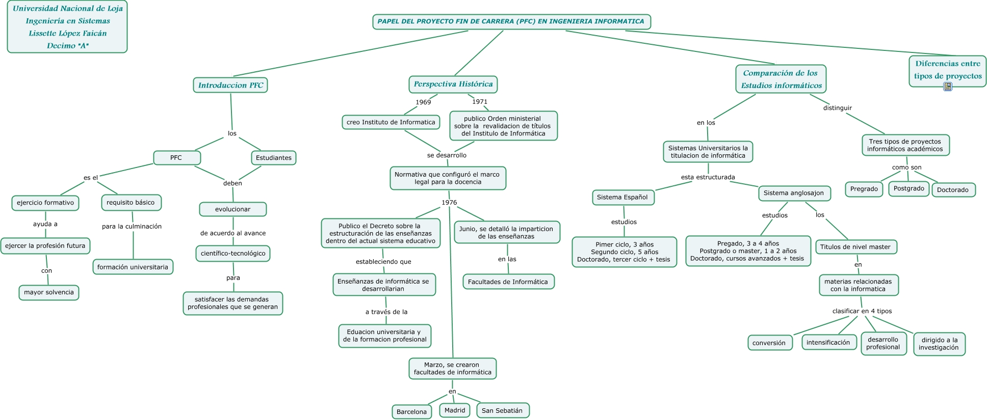 Este Cmap, tiene información relacionada con: Papel del proyecto fin de carrera en ingenieria informatica, PFC deben Estudiantes, Enseñanzas de informática se desarrollarian a través de la Eduacion universitaria y de la formacion profesional, PFC es el requisito básico, Titulos de nivel master en materias relacionadas con la informatica, Introduccion PFC los Estudiantes, PAPEL DEL PROYECTO FIN DE CARRERA (PFC) EN INGENIERIA INFORMATICA Perspectiva Histórica, publico Orden ministerial sobre la revalidacion de títulos del Institulo de Informática se desarrollo Normativa que configuró el marco legal para la docencia, materias relacionadas con la informatica clasificar en 4 tipos dirigido a la investigación, Sistema Español estudios Pimer ciclo, 3 años Segundo ciclo, 5 años Doctorado, tercer ciclo + tesis, Tres tipos de proyectos informáticos académicos como son Postgrado, ejercicio formativo ayuda a ejercer la profesión futura, PAPEL DEL PROYECTO FIN DE CARRERA (PFC) EN INGENIERIA INFORMATICA Introduccion PFC, Sistema anglosajon estudios Pregado, 3 a 4 años Postgrado o master, 1 a 2 años Doctorado, cursos avanzados + tesis, Perspectiva Histórica 1971 publico Orden ministerial sobre la revalidacion de títulos del Institulo de Informática, Publico el Decreto sobre la estructuración de las enseñanzas dentro del actual sistema educativo estableciendo que Enseñanzas de informática se desarrollarian, materias relacionadas con la informatica clasificar en 4 tipos conversión, PAPEL DEL PROYECTO FIN DE CARRERA (PFC) EN INGENIERIA INFORMATICA Comparación de los Estudios informáticos, PFC deben evolucionar, ejercer la profesión futura con mayor solvencia, creo Instituto de Informatica se desarrollo Normativa que configuró el marco legal para la docencia