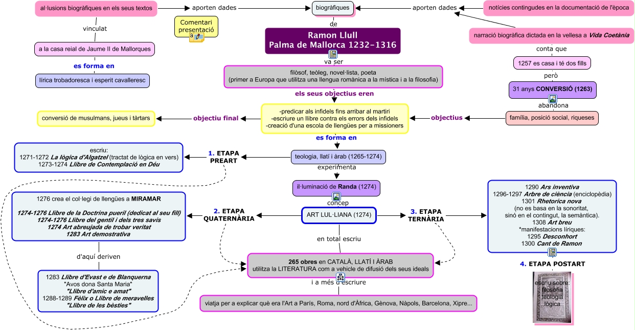 Aquest mapa conceptual conté informació relacionada amb: Presentació_eharo, viatja per a explicar què era l'Art a París, Roma, nord d'Àfrica, Gènova, Nàpols, Barcelona, Xipre... i a més d'escriure 265 obres en CATALÀ, LLATÍ I ÀRAB utilitza la LITERATURA com a vehicle de difusió dels seus ideals, al·lusions biogràfiques en els seus textos aporten dades biogràfiques, biogràfiques de Ramon Llull Palma de Mallorca 1232-1316, 1257 es casa i té dos fills conta que narració biogràfica dictada en la vellesa a Vida Coetània, 265 obres en CATALÀ, LLATÍ I ÀRAB utilitza la LITERATURA com a vehicle de difusió dels seus ideals en total escriu ART LUL·LIANA (1274), 1283 Llibre d'Evast e de Blanquerna "Avos dona Santa Maria" "Llibre d'amic e amat" 1288-1289 Fèlix o Llibre de meravelles "Llibre de les bèsties" d'aquí deriven 1276 crea el col·legi de llengües a MIRAMAR 1274-1276 Llibre de la Doctrina pueril (dedicat al seu fill) 1274-1276 Llibre del gentil i dels tres savis 1274 Art abreujada de trobar veritat 1283 Art demostrativa, ART LUL·LIANA (1274) 2. ETAPA QUATERNÀRIA 265 obres en CATALÀ, LLATÍ I ÀRAB utilitza la LITERATURA com a vehicle de difusió dels seus ideals, teologia, llatí i àrab (1265-1274) 1. ETAPA PREART 265 obres en CATALÀ, LLATÍ I ÀRAB utilitza la LITERATURA com a vehicle de difusió dels seus ideals, teologia, llatí i àrab (1265-1274) 1. ETAPA PREART escriu: 1271-1272 La lògica d'Algatzel (tractat de lògica en vers) 1273-1274 Llibre de Contemplació en Déu, filòsof, teòleg, novel·lista, poeta (primer a Europa que utilitza una llengua romànica a la mística i a la filosofia) els seus objectius eren -predicar als infidels fins arribar al martiri -escriure un llibre contra els errors dels infidels -creació d'una escola de llengües per a missioners, narració biogràfica dictada en la vellesa a Vida Coetània aporten dades biogràfiques, ART LUL·LIANA (1274) 3. ETAPA TERNÀRIA 1290 Ars inventiva 1296-1297 Arbre de ciència (enciclopèdia) 1301 Rhetorica nova (no es basa en la sonoritat, sinó en el contingut, la semàntica). 1308 Art breu *manifestacions líriques: 1295 Desconhort 1300 Cant de Ramon, família, posició social, riqueses abandona 31 anys CONVERSIÓ (1263), filòsof, teòleg, novel·lista, poeta (primer a Europa que utilitza una llengua romànica a la mística i a la filosofia) va ser Ramon Llull Palma de Mallorca 1232-1316, a la casa reial de Jaume II de Mallorques vinculat al·lusions biogràfiques en els seus textos, ART LUL·LIANA (1274) 3. ETAPA TERNÀRIA 265 obres en CATALÀ, LLATÍ I ÀRAB utilitza la LITERATURA com a vehicle de difusió dels seus ideals, família, posició social, riqueses objectius -predicar als infidels fins arribar al martiri -escriure un llibre contra els errors dels infidels -creació d'una escola de llengües per a missioners, -predicar als infidels fins arribar al martiri -escriure un llibre contra els errors dels infidels -creació d'una escola de llengües per a missioners objectiu final conversió de musulmans, jueus i tàrtars, lírica trobadoresca i esperit cavalleresc es forma en a la casa reial de Jaume II de Mallorques, 1290 Ars inventiva 1296-1297 Arbre de ciència (enciclopèdia) 1301 Rhetorica nova (no es basa en la sonoritat, sinó en el contingut, la semàntica). 1308 Art breu *manifestacions líriques: 1295 Desconhort 1300 Cant de Ramon 4. ETAPA POSTART escriu sobre: filosofia teologia lògica